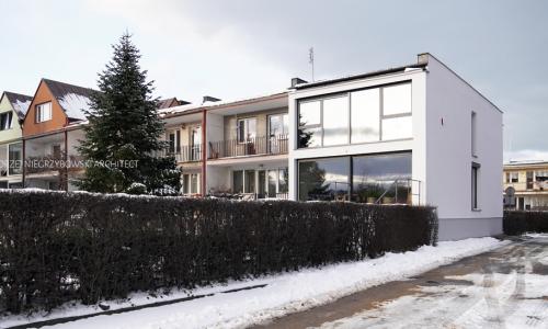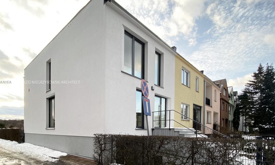 Istniejący, skrajny szereg to dom jednorodzinny z lat 70 obarczony mankamentami użytkowymi i funkcjonalnymi, wynikającymi z ówczesnych standardów mieszkaniowych, wieloletnich nawarstwień i modyfikacji. Dom w zamierzeniu Inwestorów miał się stać wygodną, przestronną, nowoczesną i przyjazną przestrzenią dla pary energicznych emerytów. Plan zatem przewiduje nie tyle korektę co prawdziwą rewolucję tak wewnątrz jak i na zewnątrz.