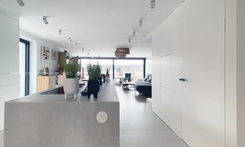 Salon, poza tym że wizualnie i funkcjonalnie połączony z kuchnią a w dalszej perspektywie także z jadalnią, został powiększony o dotychczasową loggię i uzyskał przeszklenie na całą szerokość i wysokość ściany szczytowej. Okno to daje perspektywę na przydomowy ogród i tereny zielone w dalszej perspektywie. Wyjście prowadzące na nowo projektowany taras prowadzi przez suwane, olbrzymie szklane drzwi.