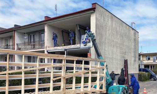 Dom z zewnątrz stara się, pomimo nowych okien i zmiany ich geometrii, kontynuować rytm i powtarzalny podział elewacji tak frontowej jak i ogrodowej. Zachowana została zasada polegająca na asymetrii elewacji frontowej i zestawieniu naprzemiennie otworów okiennych większych z mniejszym. Dodatek stanowią donico-balkony urozmaicające rysunek elewacji wzbogacając ją o pojawiający się za ich sprawą światłocień oraz wszędobylską zieleń. Elementy te stanowią też zadaszenie nowo projektowanych schodów wejściowych do domu. Zieleń rosnąca w donicach to także element mający wpływ na wnętrze. Rośliny będą doskonale widoczne przez okna zaplanowane do samej ziemi tj donice stanowią, wraz z zielenią przedłużenie posadzki.