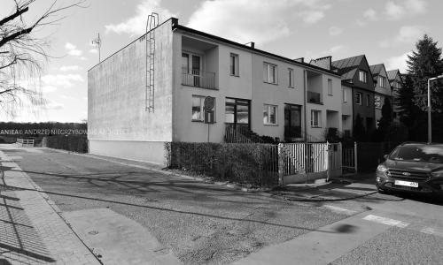 Ściana szczytowa, pozbawiona dotychczas jakichkolwiek elementów, nie licząc drabiny prowadzącej na dach, zyska dwa nowe okna zaaranżowane jedno nad drugim. Wraz z zielenią otulającą dom i pnącą się po cięgnach rozpiętych na elewacji zbawiennie wpływa na jakość niewielkiego wnętrza urbanistycznego oraz pozytywnie zmienia wizualny odbiór całego szeregu.