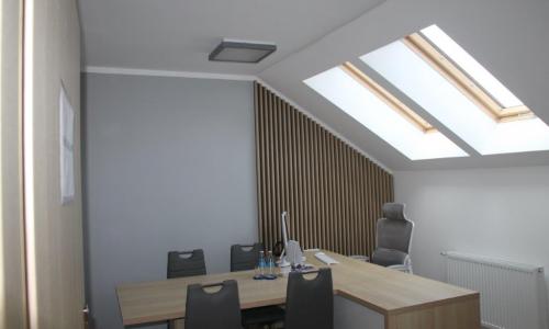• Wymianę więźby dachowej i pokrycia dachu, docieplenie dachu wełną mineralną o grubości 25 cm i zabezpieczenie jej płytami karton-gips, dzięki czemu uzyskano obniżenie współczynnika ciepła z U=0,911 do U=0,12