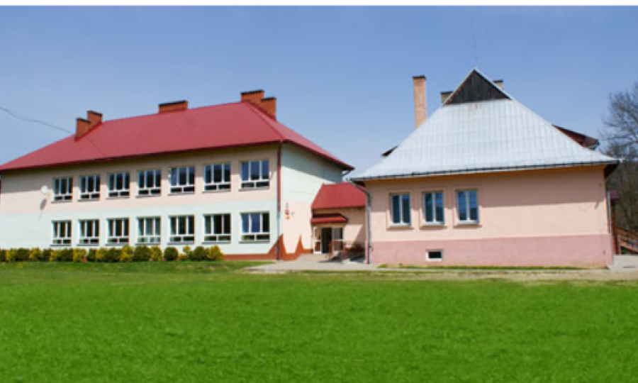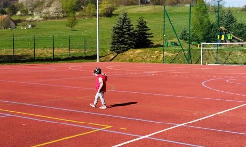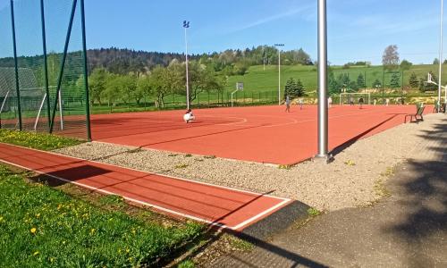 Wielofunkcyjne, przyszkolne boisko rekreacyjne o nawierzchni poliuretanowej z oświetleniem w miejscowości Krempna