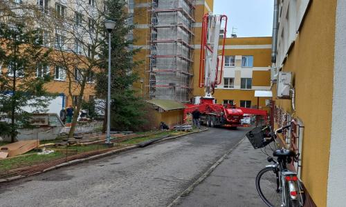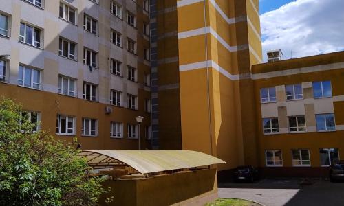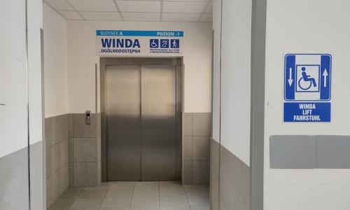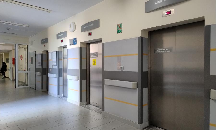 - dotrzeć do oddziałów i poradni szpitalnych, poprzez montaż dźwigu transportowego zewnętrznego przy łączniku pomiędzy budynkami E i F