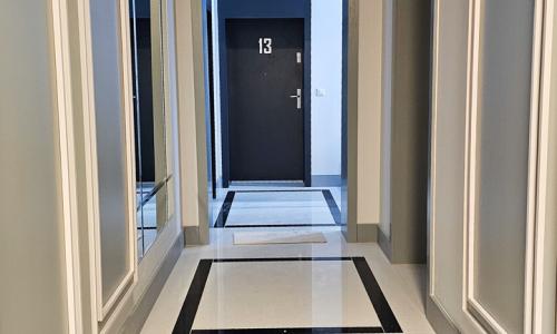 jak sztukateria, która idealnie wpasowuje się w charakter całego budynku, na korytarzu znajdują się również duże lustra dopełniające całą przestrzeń.