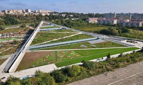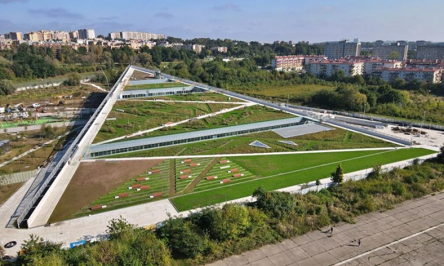Na dachu znalazł się ogród spacerowy z 12 drzewami, krzewami, trawami i bylinami oraz eksponatami plenerowymi. Ta część inwestycji jest ogólnodostępna, podobnie jak 2-hektarowy park z placem zabaw, powstałym w ramach inwestycji. To pierwsze tego typu rozwiązanie w Krakowie.