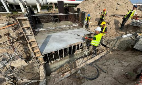 5. Ułożenie betonu podkładowego oraz wykonanie zbrojenia części fundamentu pachoła związanej bezpośrednio ze skrzynią stanowiącej fragment nabrzeża. Montaż elementów kotwiących pachoł ze zbrojeniem.