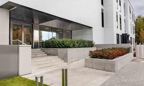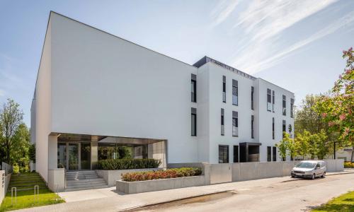 Budynek Kliniki w części ogólnodostępnej jest nieogrodzony, otwarty na ulicę, generując w ten sposób zewnętrzną przestrzeń publiczną. Wyeksponowana od strony ulicy publiczna strefa wejścia do budynku Kliniki zlokalizowana jest pod wewnętrznym patio. Wprowadza to czytelną sekwencję przestrzeni, które wzajemnie się przenikają. W strefie wejścia do budynku, zarówno na posadzkach, schodach jak i na ścianach oraz części muru ogrodzenia użyto wielkoformatowych prefabrykatów betonowych, które ujednoliciły i uporządkowały przestrzeń. Budynek poza zapewnieniem opieki medycznej ma pełnić również funkcję dydaktyczną. Na ostatnim piętrze nowej części została zaprojektowana sala konferencyjna. Historyczny, mocno zadrzewiony kontekst układu urbanistycznego dzielnicy Włochy - Miasta Ogrodu stał się pretekstem do wciągnięcia dachu budynku jako integralnej części przestrzeni wspólnej. W budynku zagospodarowano powierzchnie zielonego dachu tworząc trójwymiarową zewnętrzną przestrzeń wypoczynku i punkt widokowy na najbliższą okolicę. Z tego wyniesionego ponad dachy budynków miejsca najlepiej można docenić walory historycznego założenia Miasta – Ogrodu.