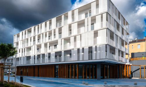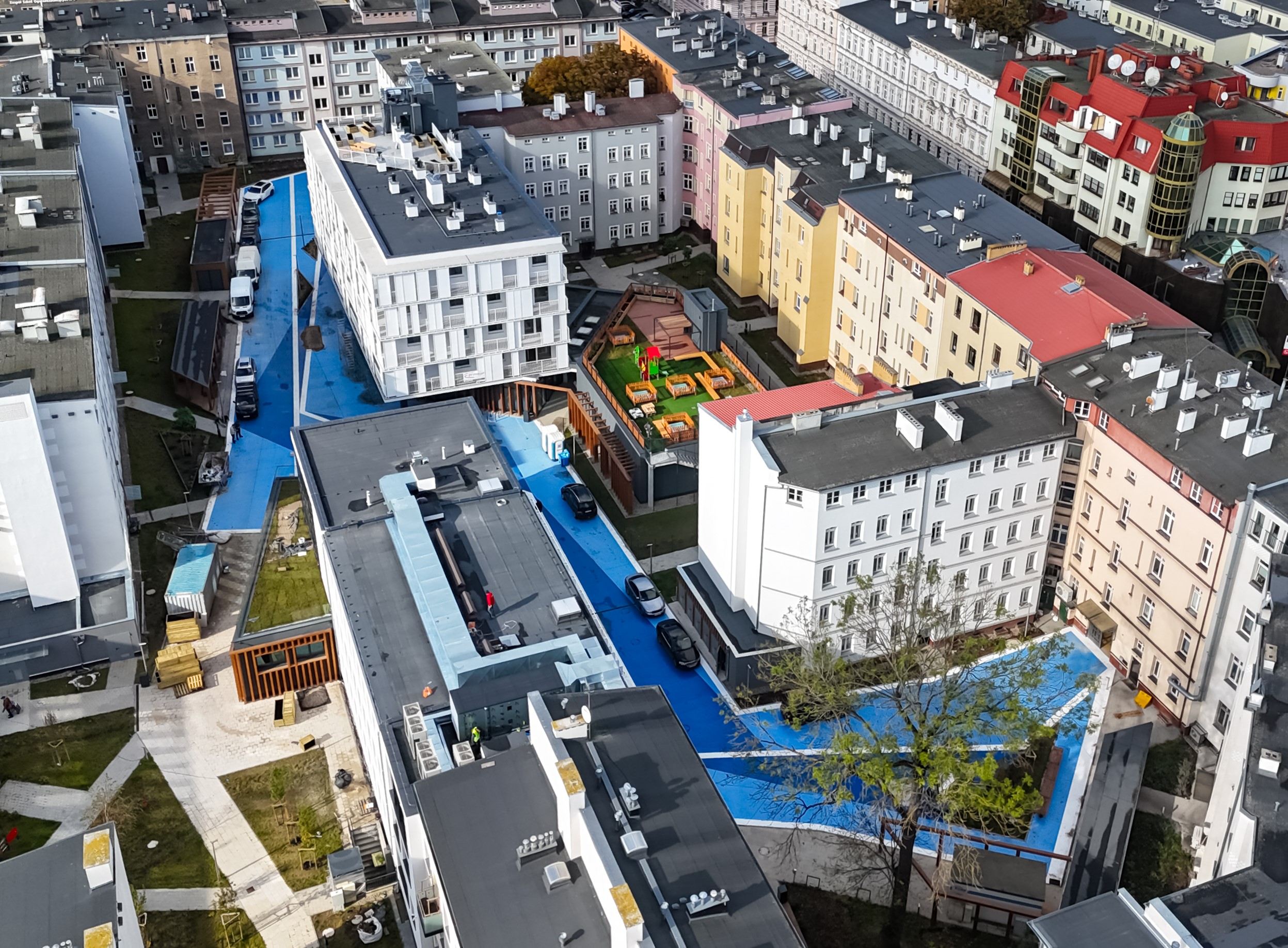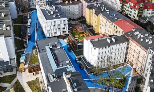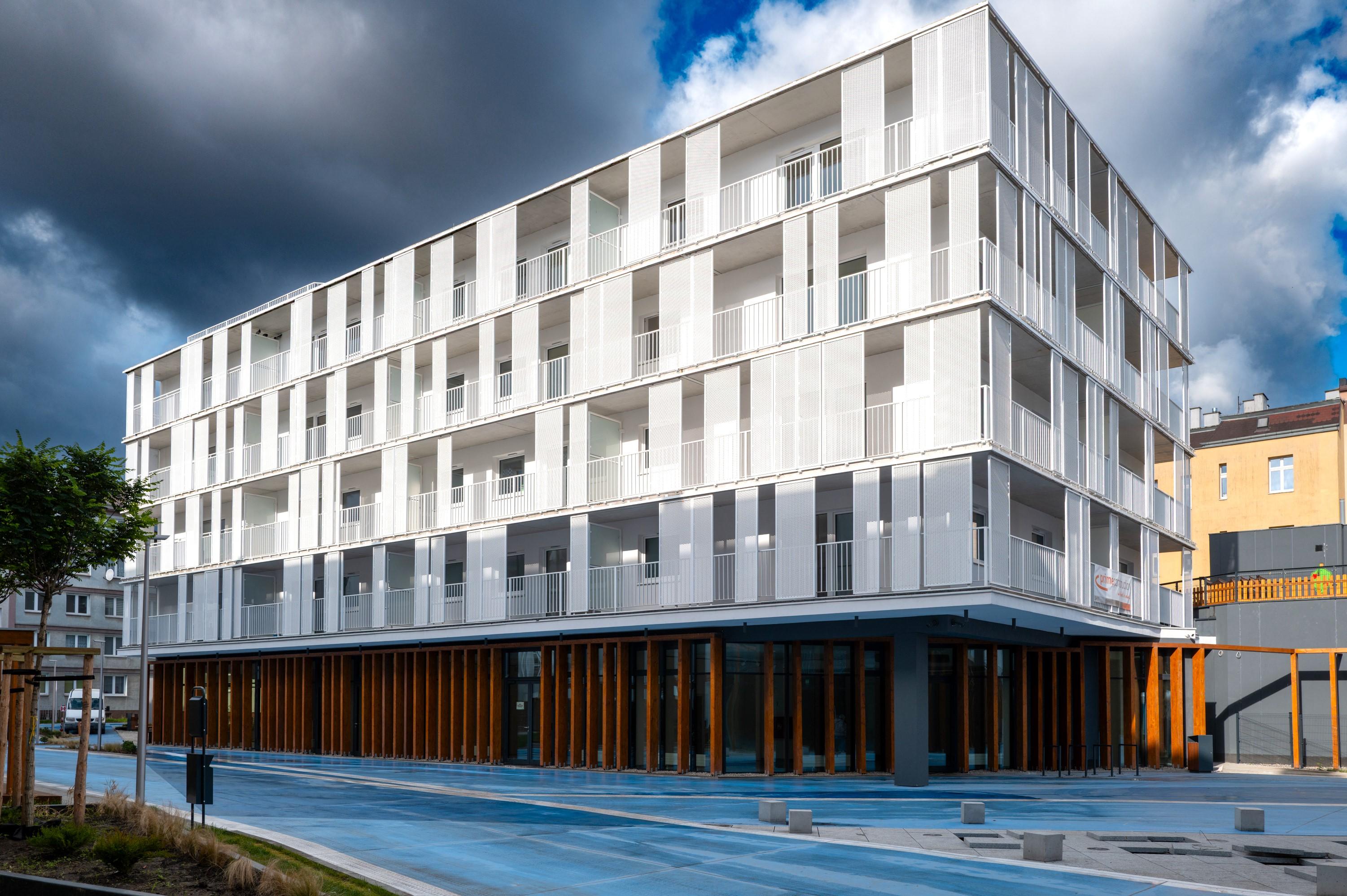 W ramach inwestycji wybudowany został także budynek mieszkalny z 30 mieszkaniami wykończonymi „pod klucz”, w tym 15 lokalami przeznaczonymi dla osób starszych oraz 3 dla osób niepełnosprawnych poruszających się na wózkach inwalidzkich. Ze względu na przeznaczenie połowy mieszkań dla osób starszych, budynek został wyposażony w windę, obsługującą wszystkie kondygnacje wraz z wjazdem na poziom dachu, na którym zaprojektowano taras przeznaczony np. na ogród warzywny dla seniorów. W parterze budynku zlokalizowany został lokal przeznaczony na potrzeby usług społecznych. W budynku znajduje się także żłobek dla dwóch grup, łącznie dla 52 dzieci z palcem zabaw na dachu budynku. W ramach przedsięwzięcia rewitalizacyjnego wybudowano również kilkukondygnacyjny budynek usługowy oraz rozbudowano i przebudowano siedzibę Szczecińskiego TBS.