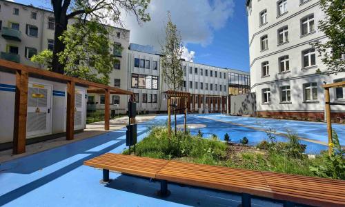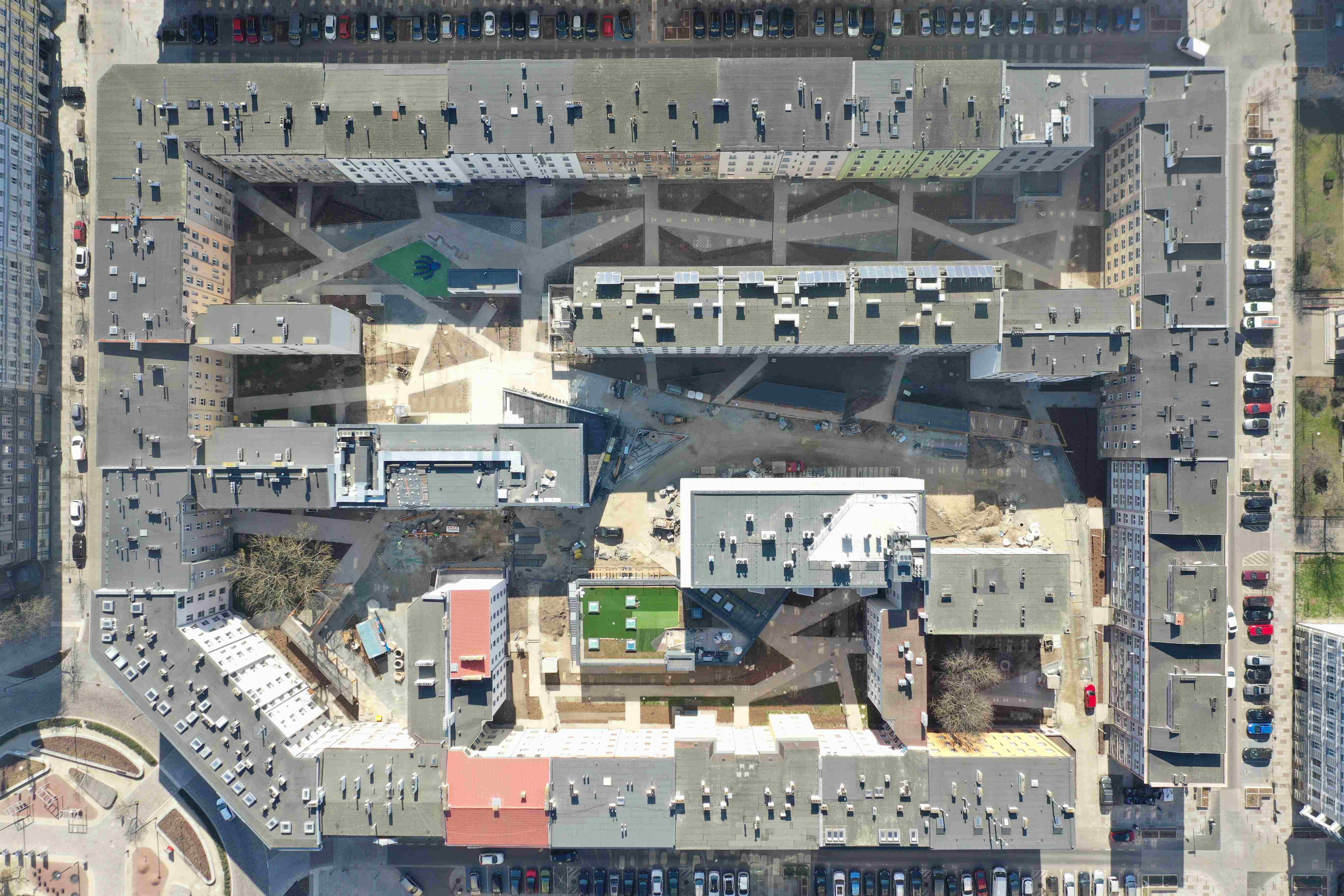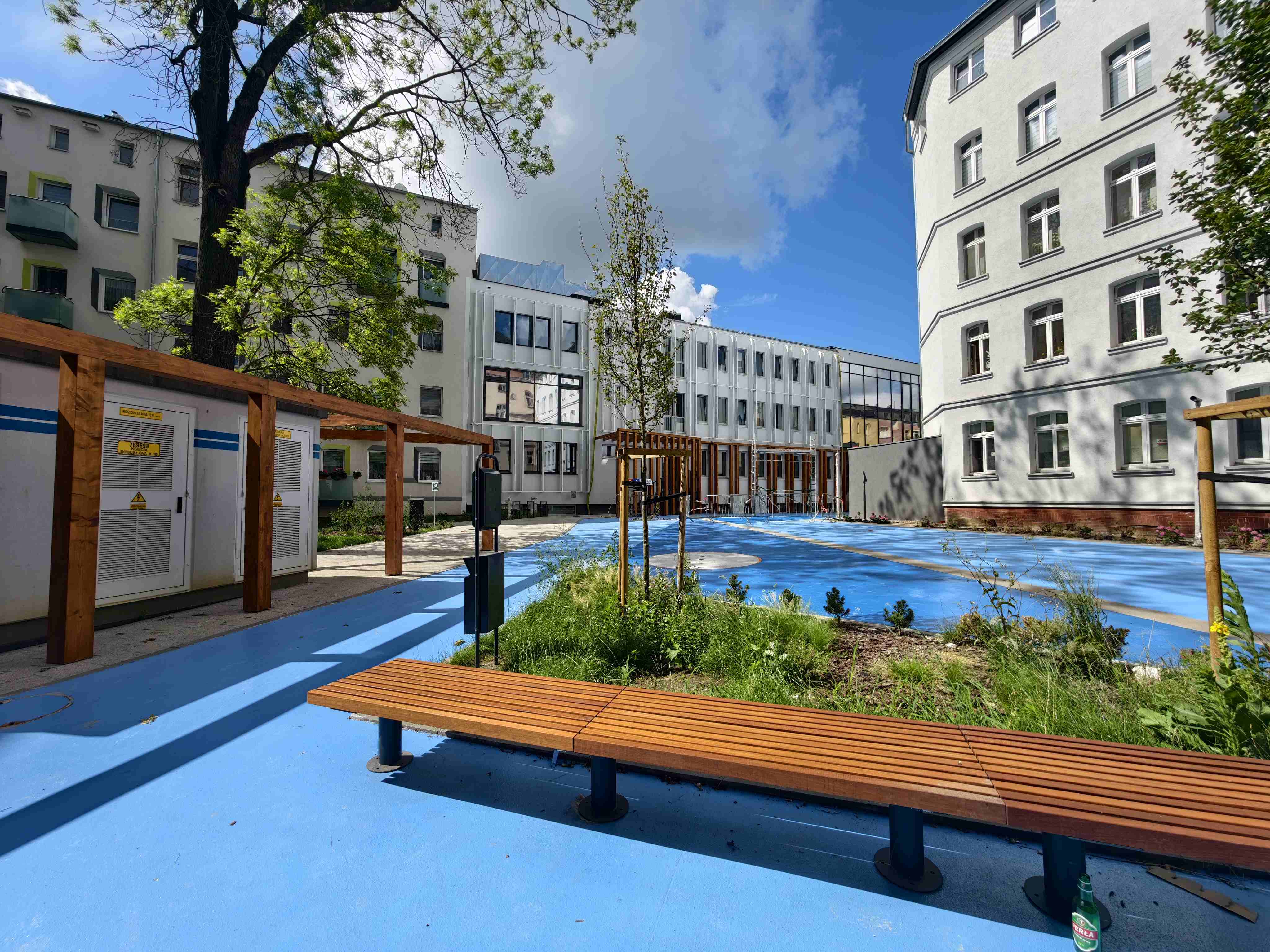 Centralna część kwartału została przeznaczona na główny plac publiczny stanowiący przestrzeń rozciągniętą od narożnika ulic Boh. Getta Warszawskiego i Bł. Królowej Jadwigi do przejścia bramowego w budynku frontowym przy ul. Bohaterów Getta Warszawskiego 1. Wzdłuż głównego placu publicznego, przez środek kwartału została poprowadzona charakterystyczna pergola – zadaszenie, pod którym zaplanowano miejsca do spotkań, rekreacji lub zabaw. Z centralnego placu publicznego zapewniony został dostęp do wszystkich podwórek zaprojektowanych w kwartale, w tym do każdego z budynków mieszkalnych (frontowych i oficynowych) oraz siedziby Szczecińskiego TBS a także do lokalu usług społecznych i żłobka. Centralny plac publiczny został wzbogacony mini amfiteatrem, fontanną w formie posadzkowych dysz, z siedziskami i zielenią.
