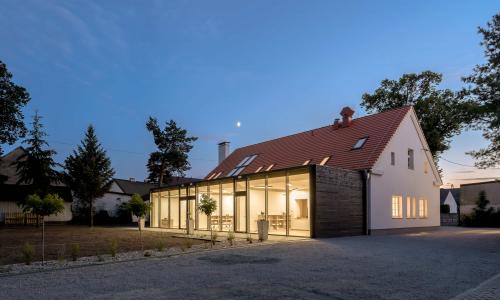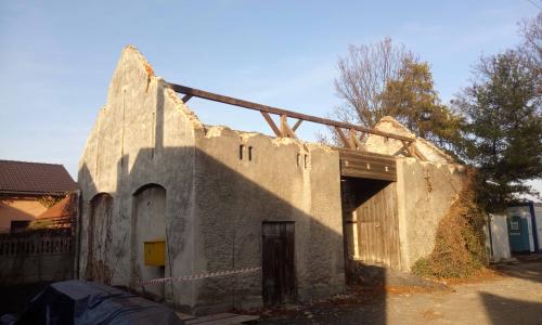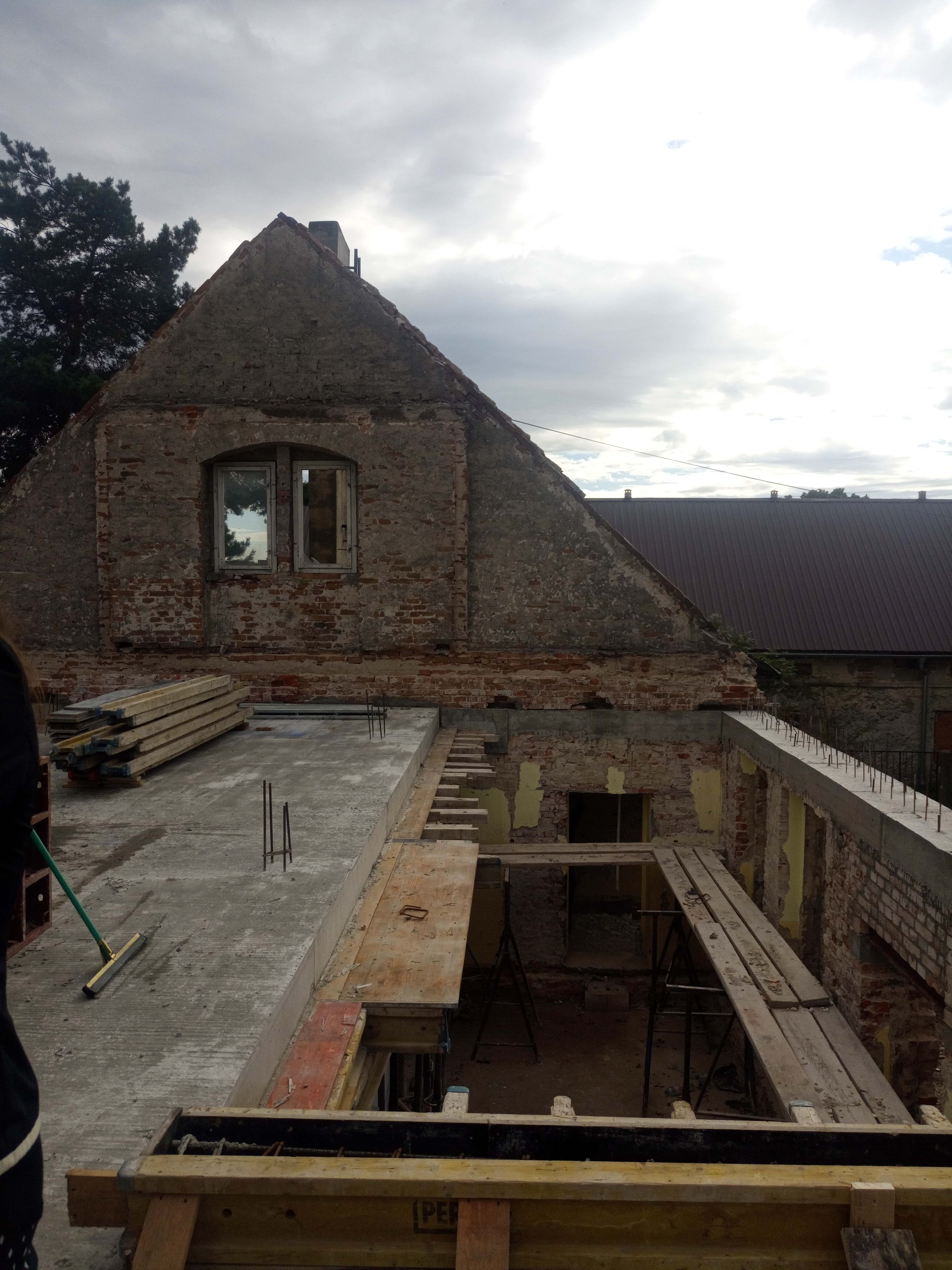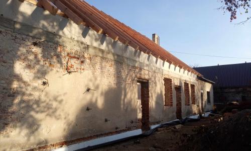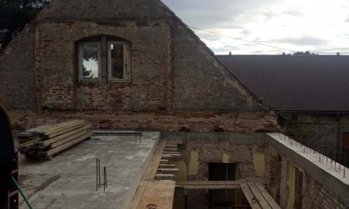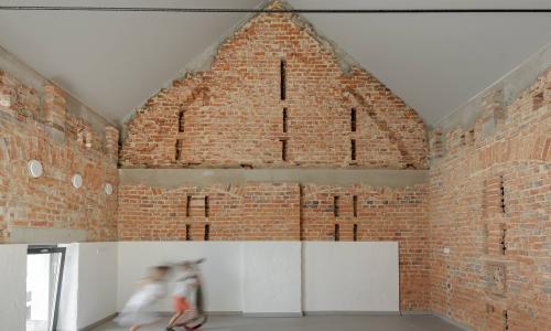 Budynek gospodarczy miał być początkowo warsztatem, lecz w trakcie procesu projektowego zyskał dodatkowe funkcje świetlicy. W miejscach istniejących otworów i bram wstawiliśmy przeszklenia doświetlające przestrzeń wielofunkcyjną. Większość ścian utrzymała swój pierwotny surowy charakter. Sklepienia, które się nie zachowały, zostały odtworzone jako betonowe.