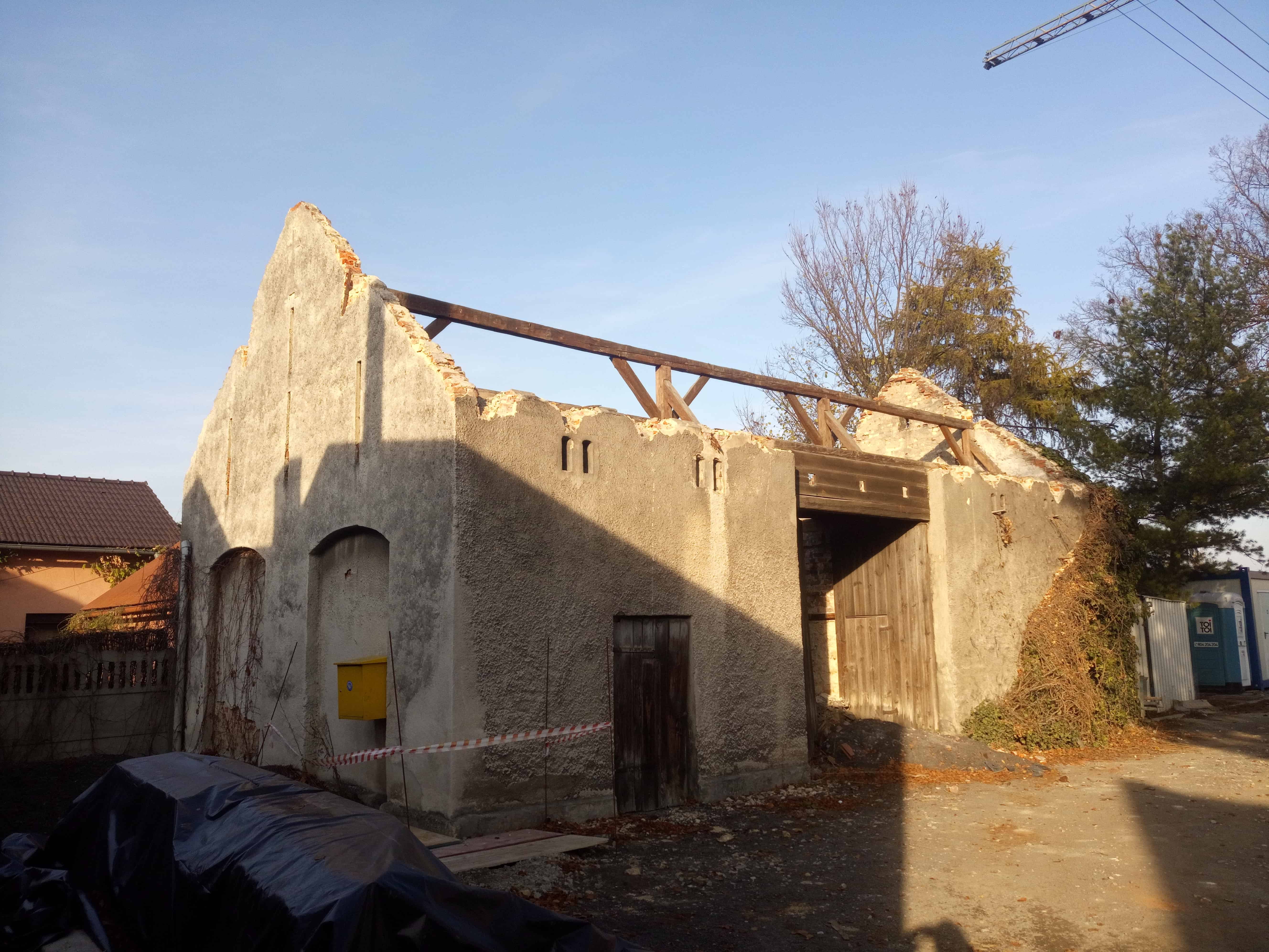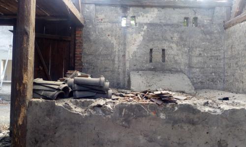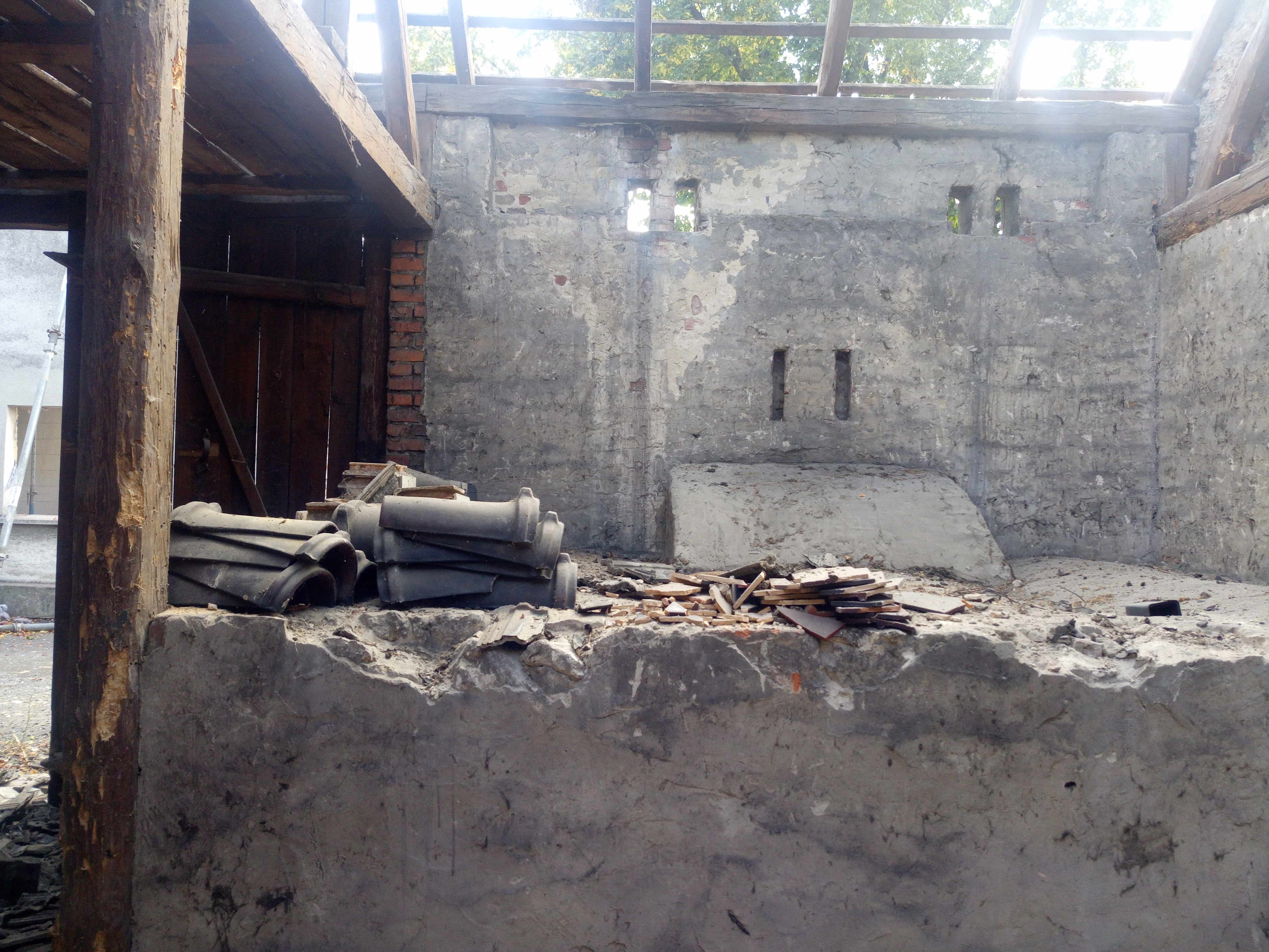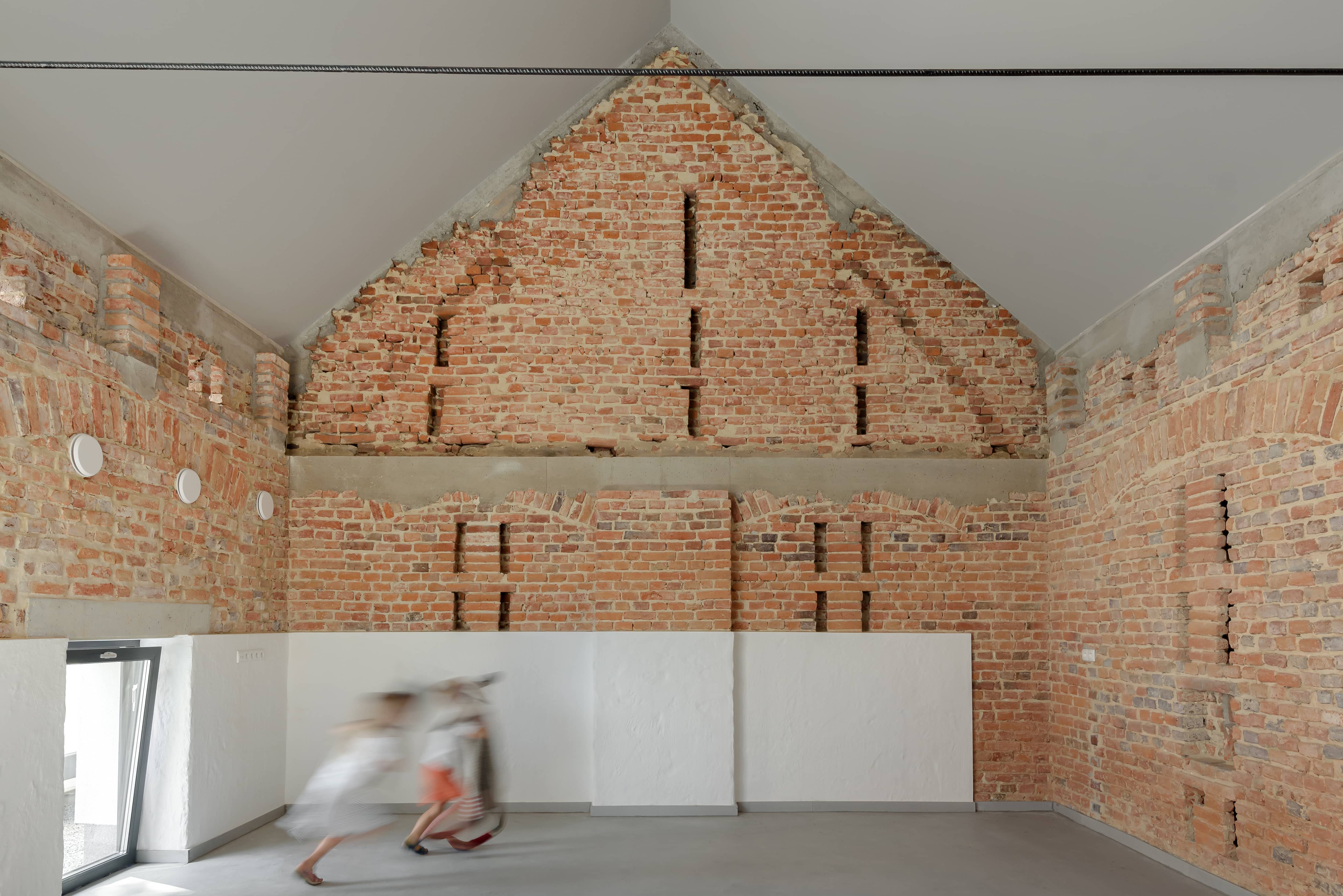Na wewnętrznych licach istniejących ścian zewnętrznych, w miejscach, gdzie jakość budulca na to pozwalała, budynki pokazują swoją strukturę. Czasem jest to fragment starego nadproża, czasem zamurowanie lub przemurowanie, tworzące oryginalne obrazy, ale też opowiadające historię i oddziałując na różne zmysły.