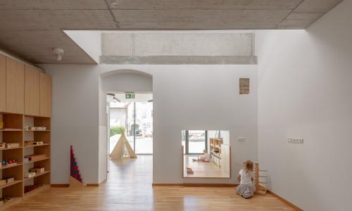Do budynku starej szkoły (pełniącego dawniej również funkcję domu nauczyciela) przenieśliśmy przedszkole. W oryginalny obrys ścian zewnętrznych wstawiliśmy zupełnie nowy układ funkcjonalny z nowymi ścianami wewnętrznymi, stropami, posadzkami, dachem. Ze względu na wymagania powierzchniowe musieliśmy rozbudować budynek przedszkola, chcieliśmy jednak pokazać też jego pierwotny gabaryt i formę, dlatego oryginalna elewacja jest widoczna przez szklaną fasadę. Stara ściana dzieli każdą z sal przedszkolnych na dwie części: bardziej introwertyczną – wewnętrzną, oświetloną za pomocą studni doświetlających przez dach oraz ekstrawertyczną, będącą „podwórkiem” – od podłogi po sufit rozświetloną i połączoną z zewnętrzem przeszkleniem. Budynek istniejący oraz dobudowa mają różne charaktery materiałowe, tak aby zarówno zewnętrznie, jak i wewnętrznie można było odczytać ich odrębność przestrzenną i czasową. Odrębny charakter nadaliśmy również dobudówce z czasów PRL-u z charakterystycznym wielkim kominem, zachowując jej oryginalne piękno.