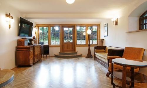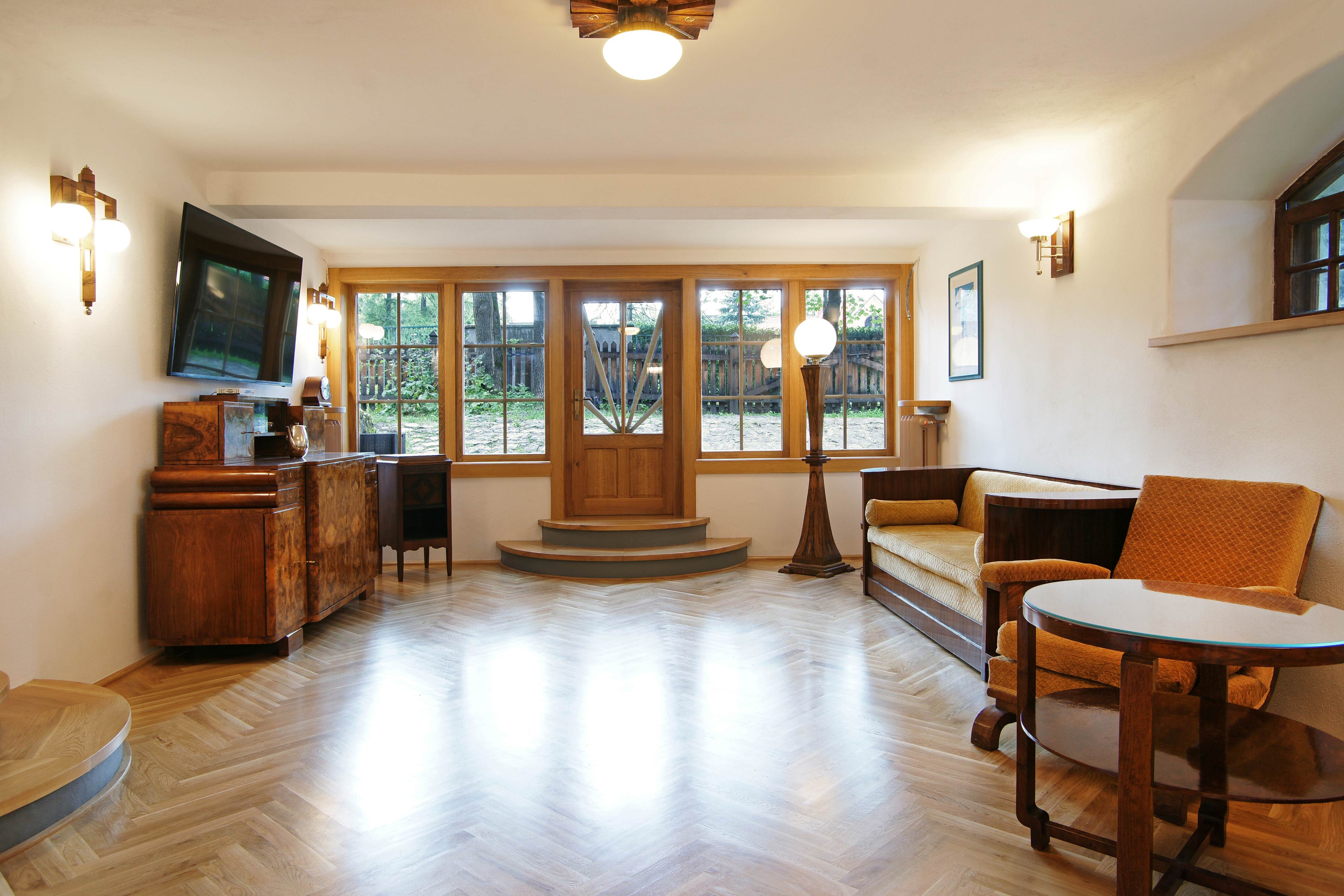 Część hotelowa Domu mieści się na parterze, gdzie znajdują się cztery sypialnie, trzy pomieszczenia wspólne – to weranda, pokoje werandowy i kominowy (zwany tak od dwóch murowanych przewodów kominowych) z którego schodzimy do nowej części, na którą składają się: pokój jadalny z kuchnia dla gości, salon, sauna, salon łazienkowy z czterema łazienkami, dodatkowa toaleta. Wszystko, choć bardzo komfortowe i eleganckie, też wyposażone historycznie w sprzęty i meble z okresu międzywojennego w stylu art deco.