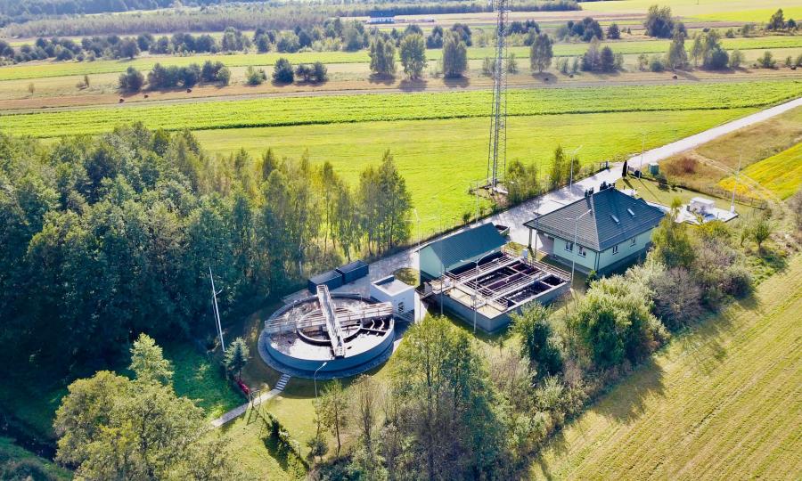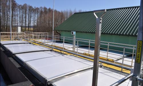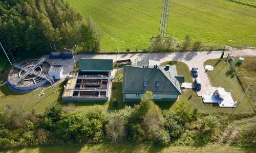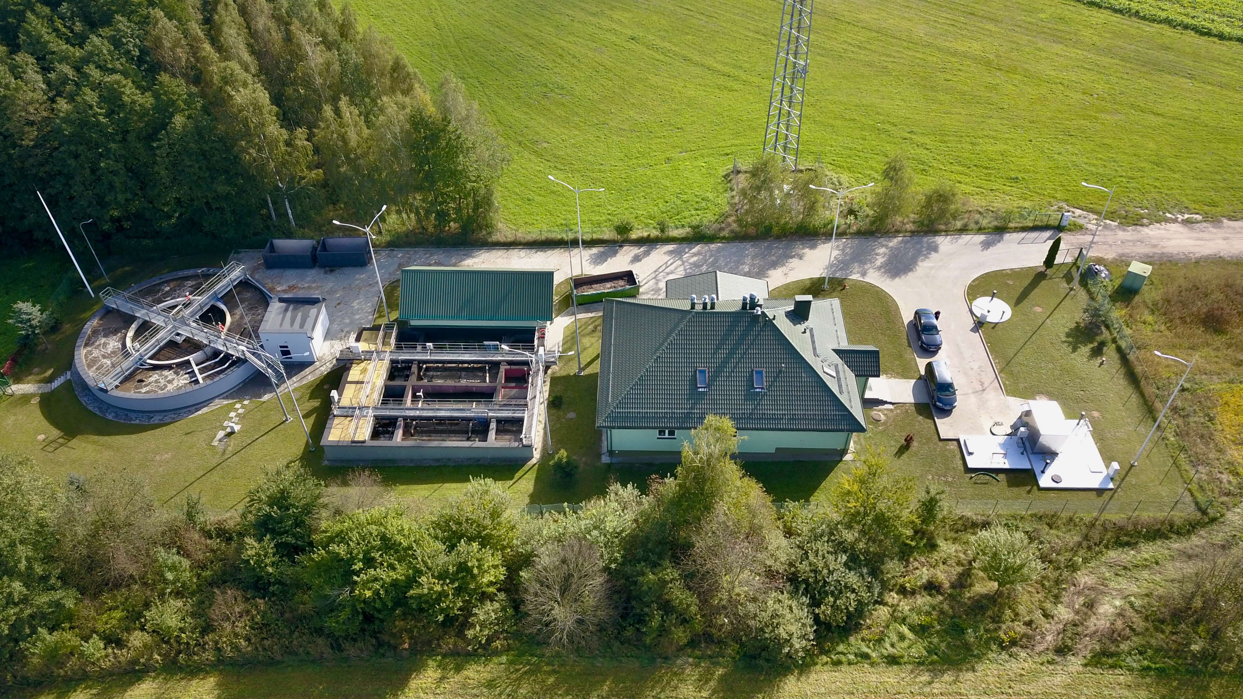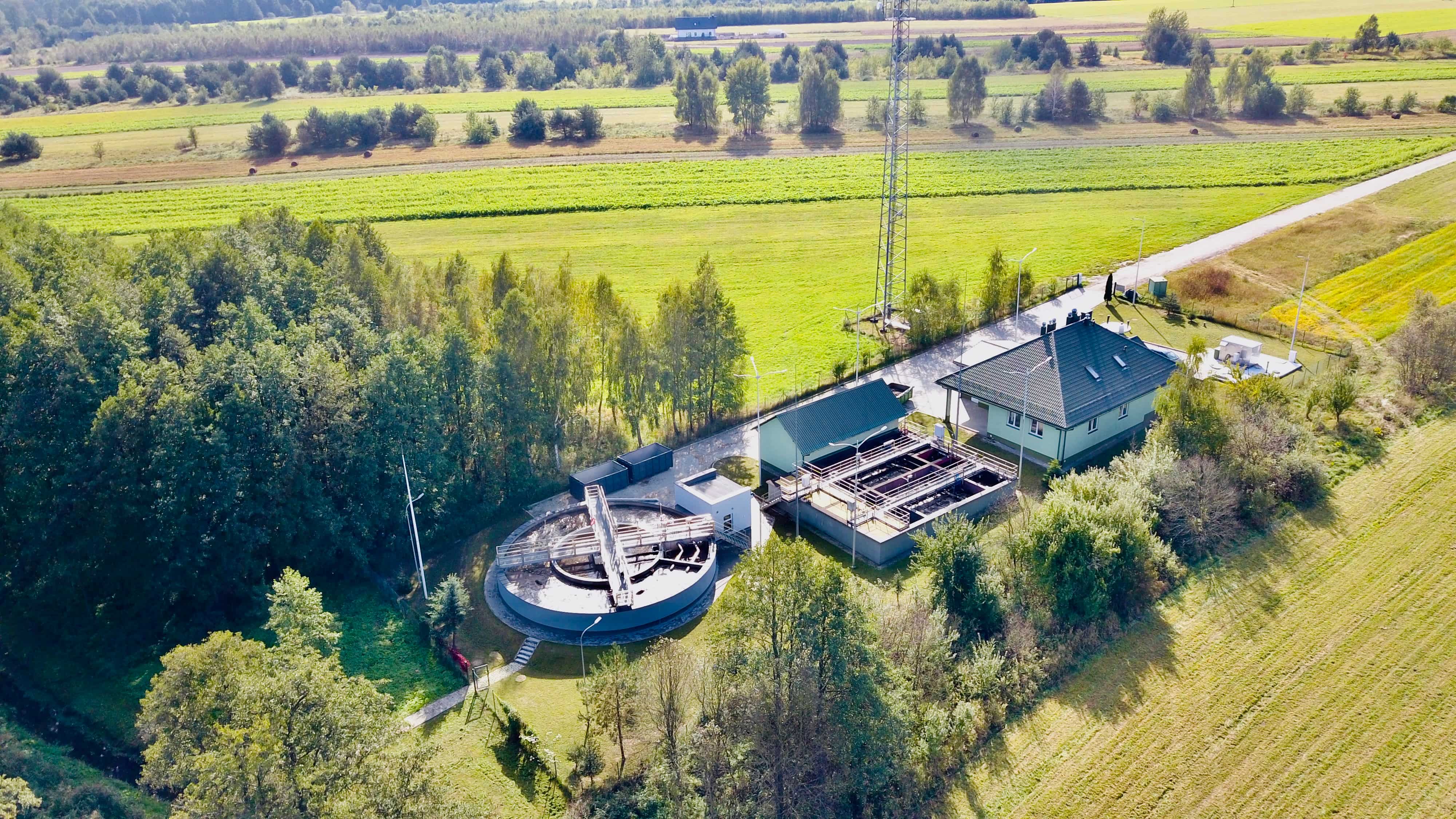Kluczowym elementem zadania była budowa nowego bloku biologicznego o przepustowości około 650 m³/d. W jego ramach powstał zadaszony reaktor biologiczny pracujący w nowoczesnej technologii hybrydowej ze złożami stacjonarnymi, wyposażony w wysokowydajny system napowietrzania. Rozwiązanie to zwiększa stabilność procesów biologicznych, poprawia skuteczność usuwania związków organicznych oraz biogenów, a jednocześnie optymalizuje zużycie energii. Wewnątrz pierścienia reaktora zlokalizowano nowy osadnik wtórny, wydzielono zbiornik osadu nadmiernego (ZON) oraz wykonano suchą pompownię osadu recyrkulowanego i nadmiernego wraz ze stacją dozowania PIX. Istniejąca stacja dmuchaw została doposażona w trzy nowe urządzenia zapewniające odpowiednie parametry pracy całego układu.