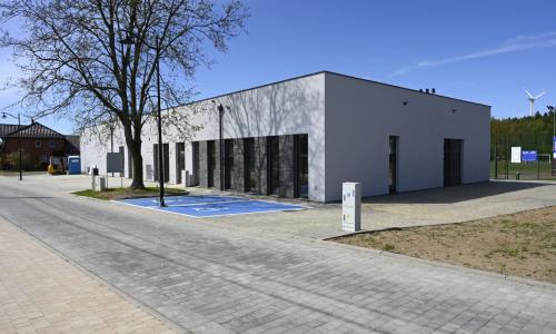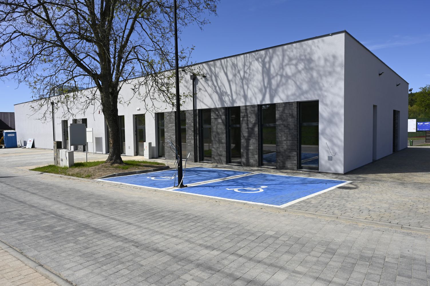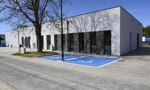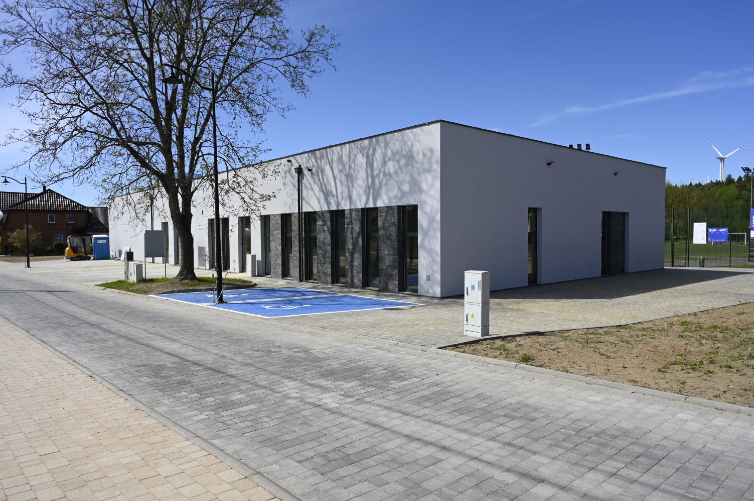 W ramach zagospodarowania terenu wykonano 13 miejsc postojowych, w tym 2 miejsca przeznaczone dla osób z niepełnosprawnościami, 2 miejsca dla pojazdów posiadających kartę parkingową oraz 3 stanowiska ładowania samochodów elektrycznych, co stanowi element nowoczesnego i odpowiedzialnego podejścia do kształtowania przestrzeni publicznej. Gminne Centrum Kultury i Turystyki Lokalnej w Krzęcinie stało się trwałym elementem struktury przestrzennej miejscowości oraz jej nową wizytówką, łącząc funkcję kulturalną, edukacyjną i administracyjną w jednym, nowoczesnym i w pełni funkcjonalnym obiekcie.