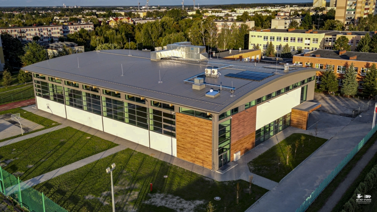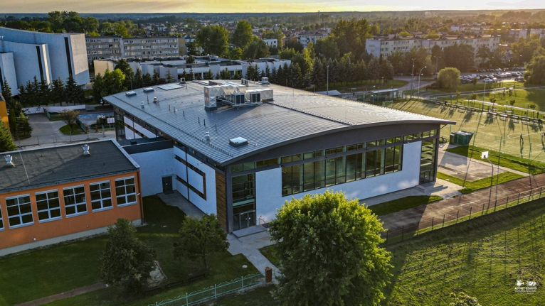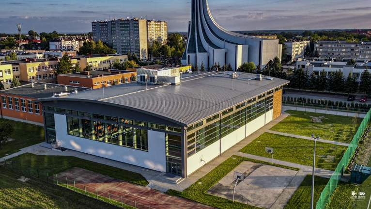 Hala widowiskowo-sportowa o wymiarach ok 37x53m z widownią oraz zapleczem socjalnym. W hali znajduję sala gimnastyczna (z pełnowymiarowym boiskiem do gry w piłkę ręczną 20x40) wyposażona we własne zespoły szatniowe oraz część techniczna. Zaprojektowana hala pełni funkcje sportowe, kulturowe oraz oświatowe, w zależności od odbywających się w niej spotkań i wydarzeń. Hala posiada dodatkowo dwa pomieszczenia sportowo-rekreacyjne z własnymi zespołami sanitarnymi, które mogą być wykorzystane na salę gimnastyczną, siłownię i/lub salę do ćwiczeń aerobiku. Dodatkowo wybudowany został łącznik pomiędzy nową halą a istniejącym budynkiem szkoły.