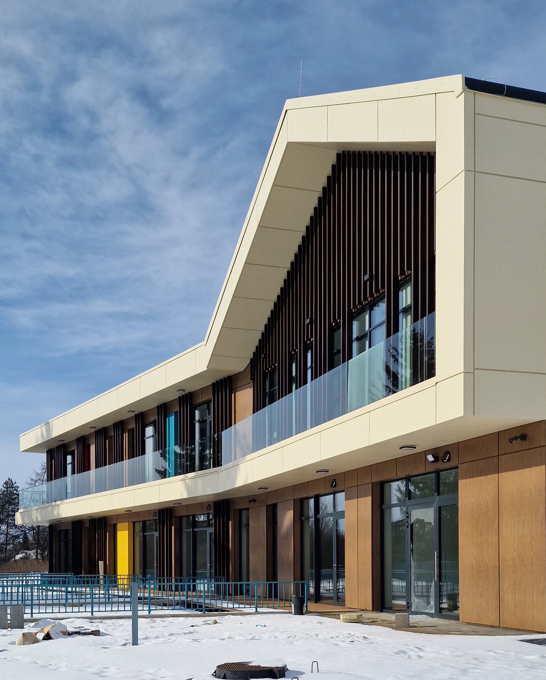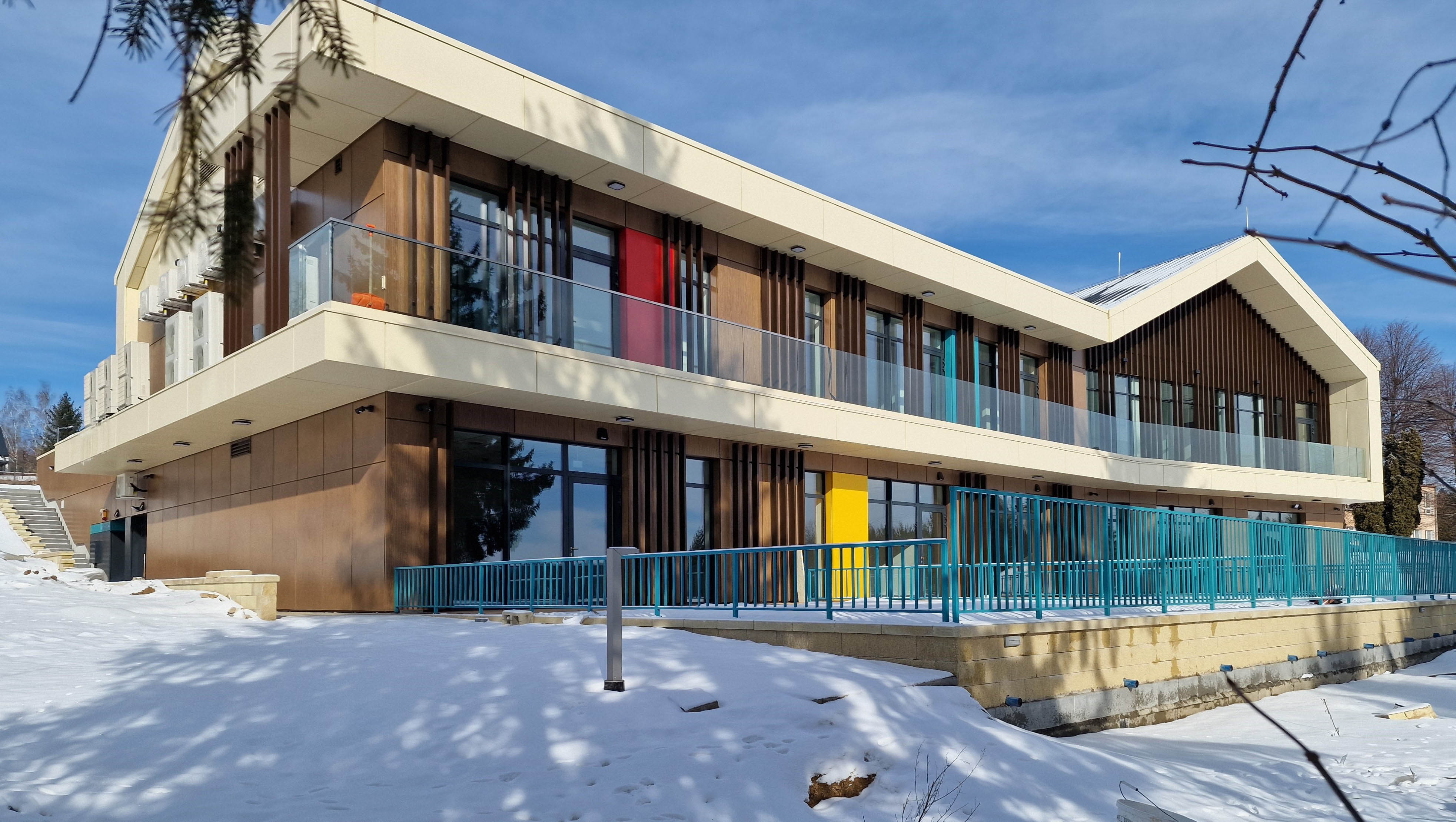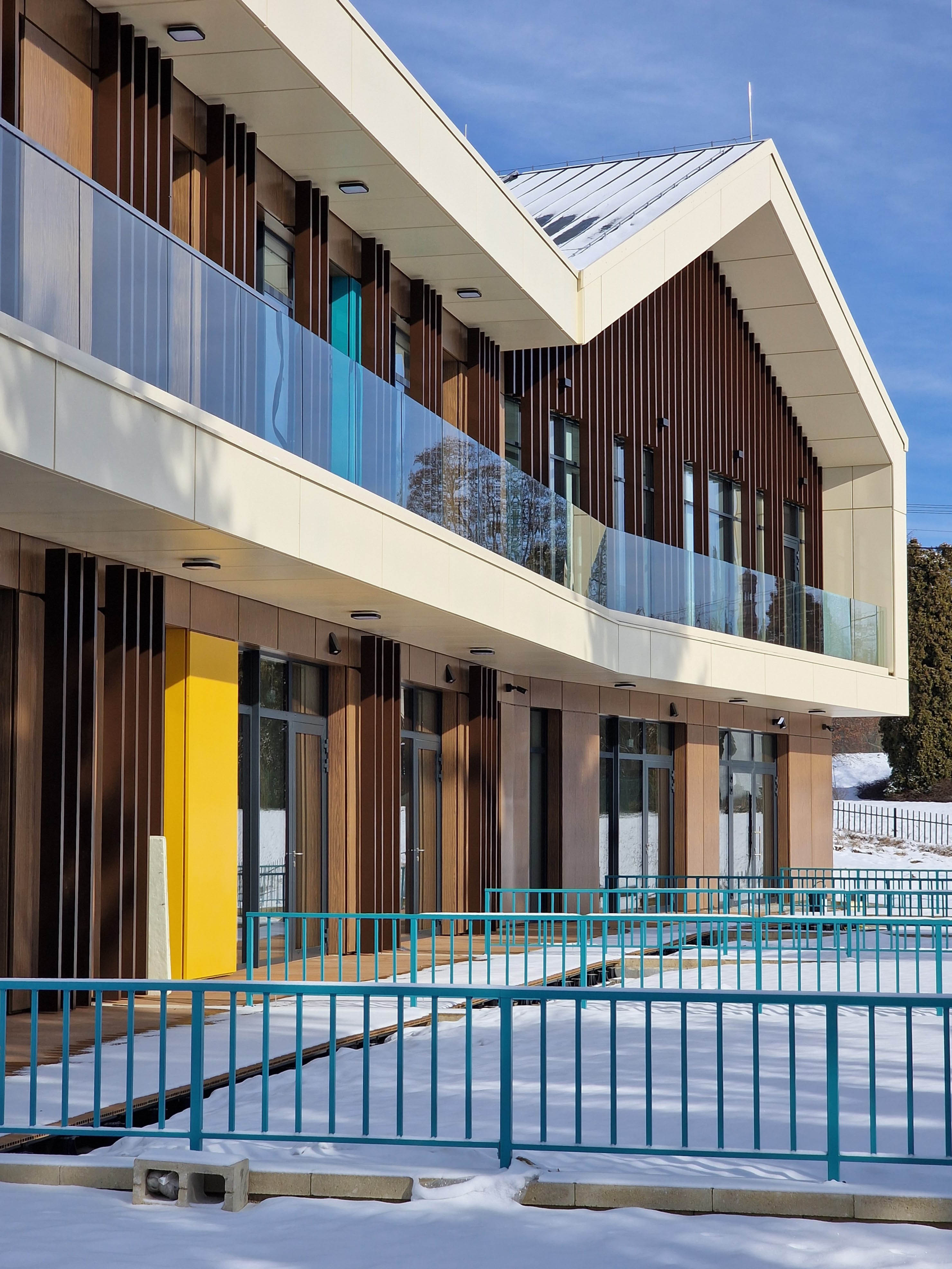 Na elewacji wykorzystano trwałe i nowoczesne materiały - wentylacja 3 warstwowa wentylowana w stonowanych barwach a jednocześnie z akcentami kolorystycznymi zmiękczającymi formę obiektu.