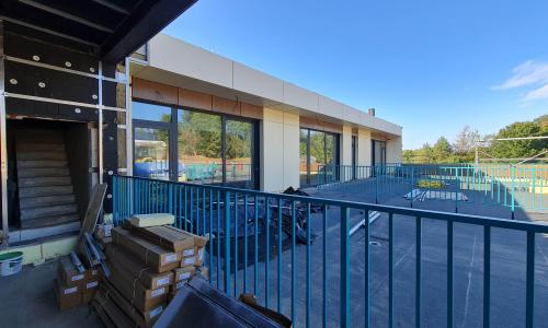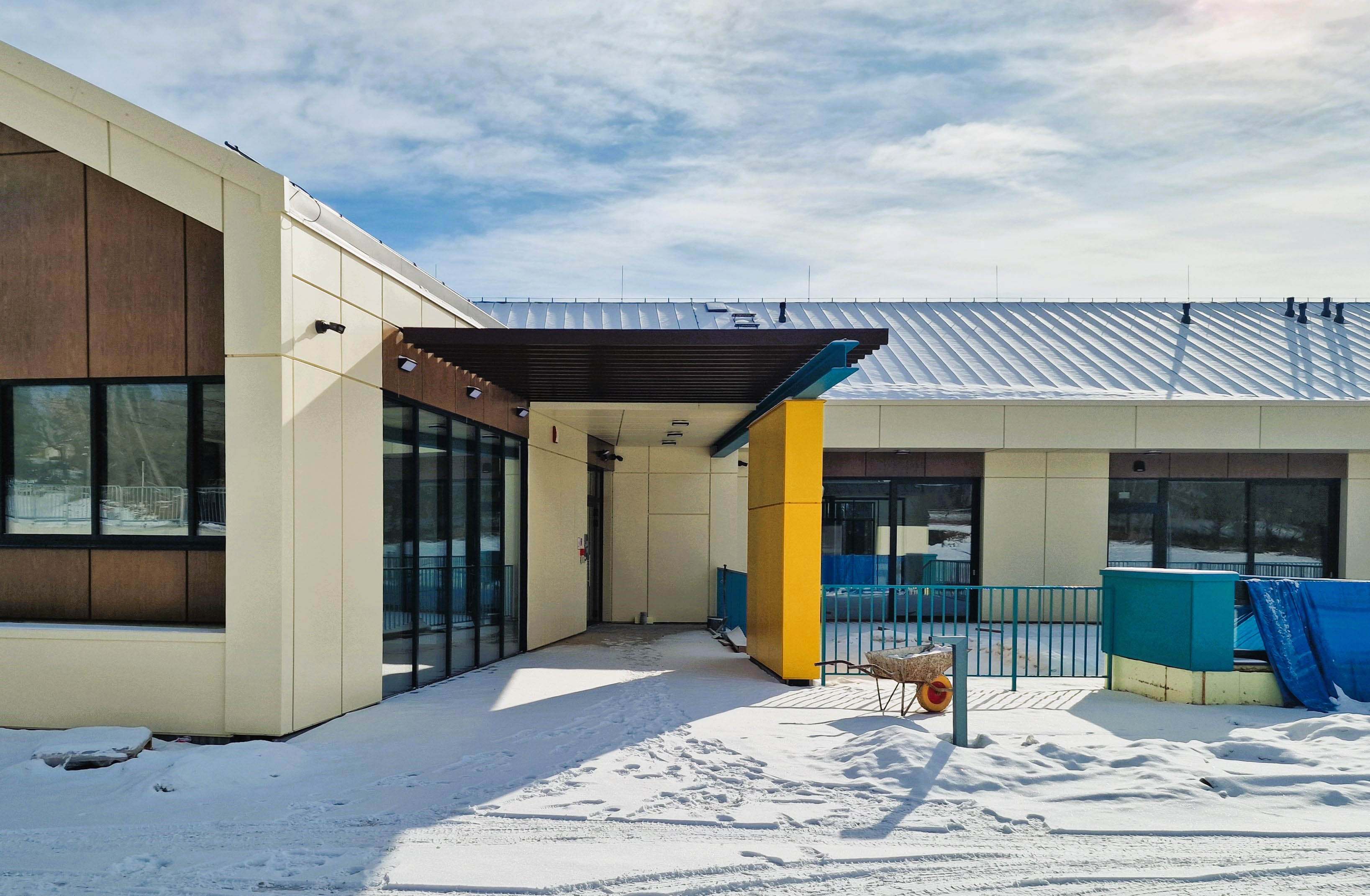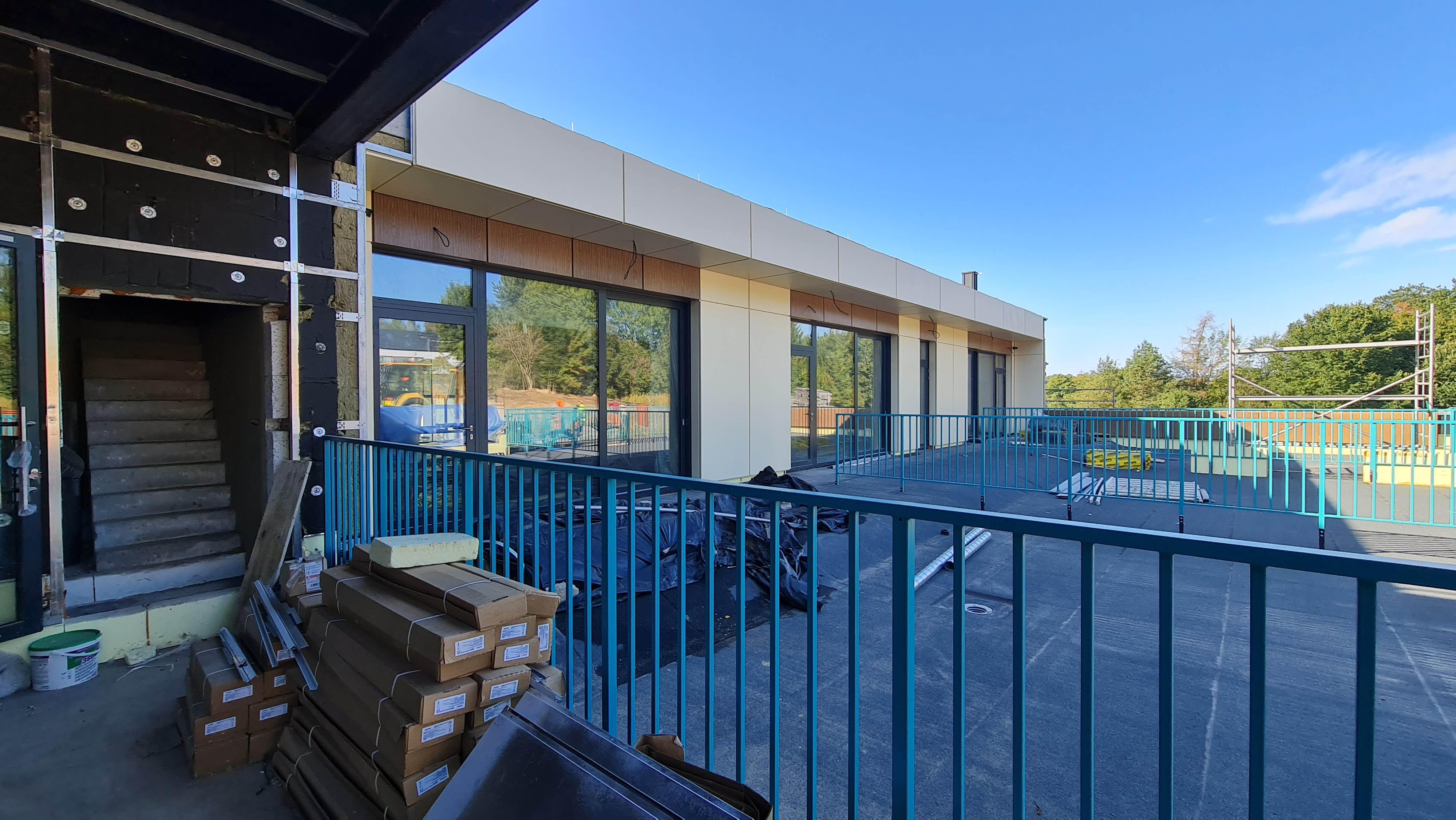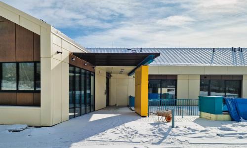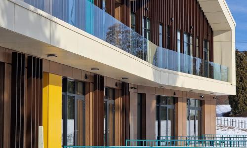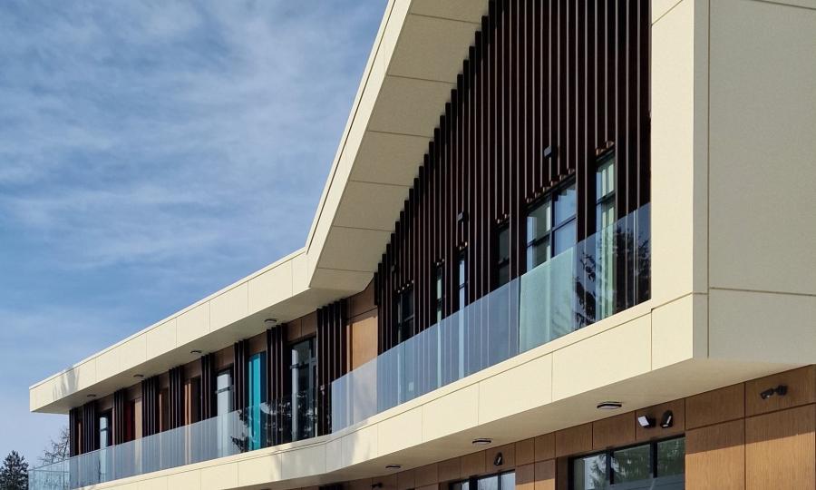 Na elewacji wykorzystano trwałe i nowoczesne materiały - wentylacja 3 warstwowa wentylowana w stonowanych barwach a jednocześnie z akcentami kolorystycznymi zmiękczającymi formę obiektu.