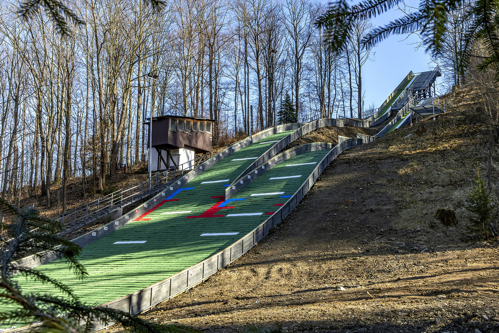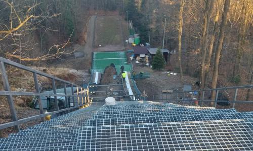 Kompleksowy remont skoczni HS31 i HS19 w Bystrej (ul. Ochota) objął elementy kluczowe dla funkcjonowania całego obiektu: wymianę drewnianej wieży HS31 na stalową (na istniejących fundamentach), modernizację pomostu startowego HS19, całkowitą wymianę konstrukcji i poszycia rozbiegów, przebudowę strefy zeskoku (m.in. żelbetowe wzmocnienia, nowe deskowanie i maty igielitowe), wymianę barier oraz remont zaplecza trenerskiego i infrastruktury dojść.