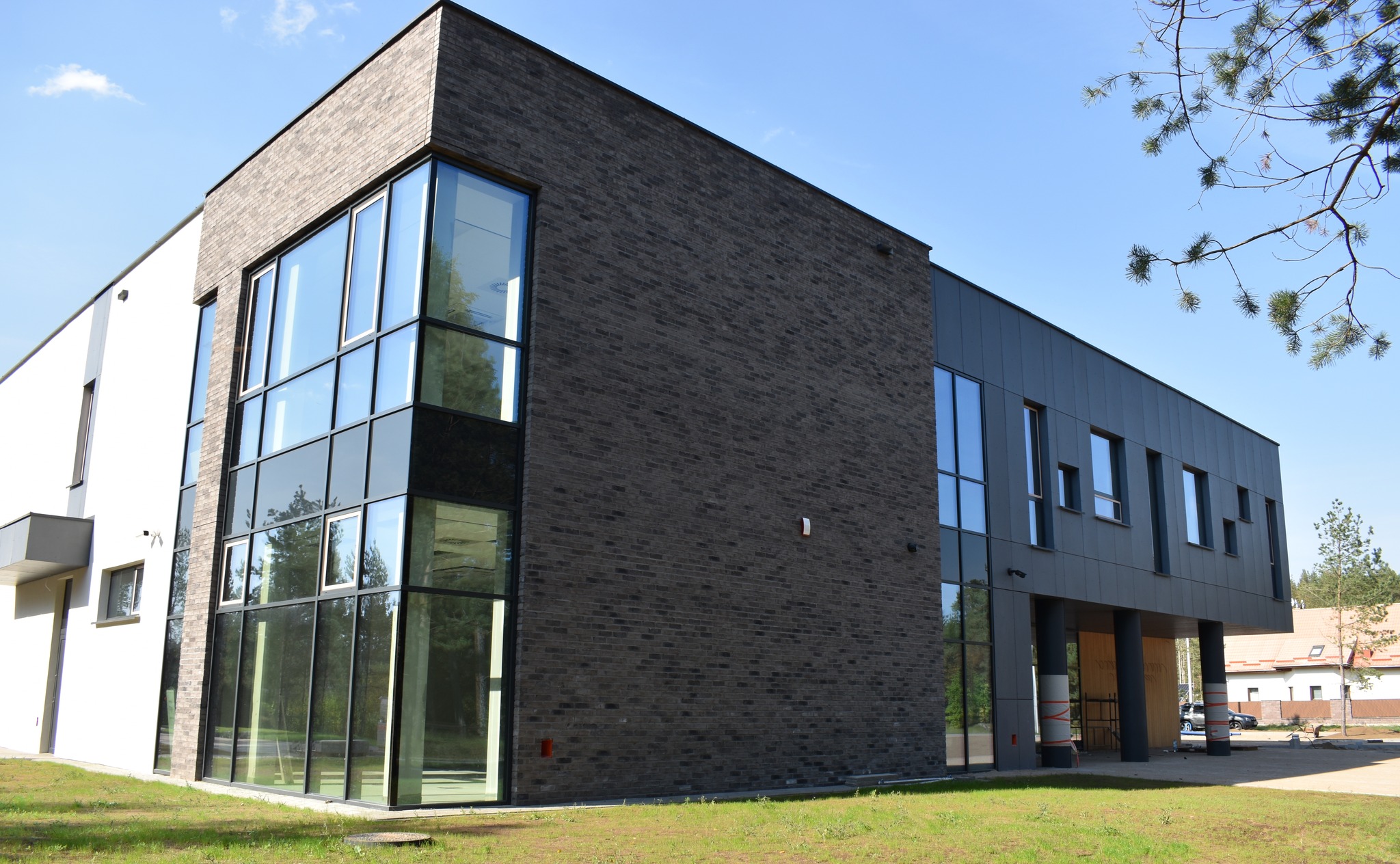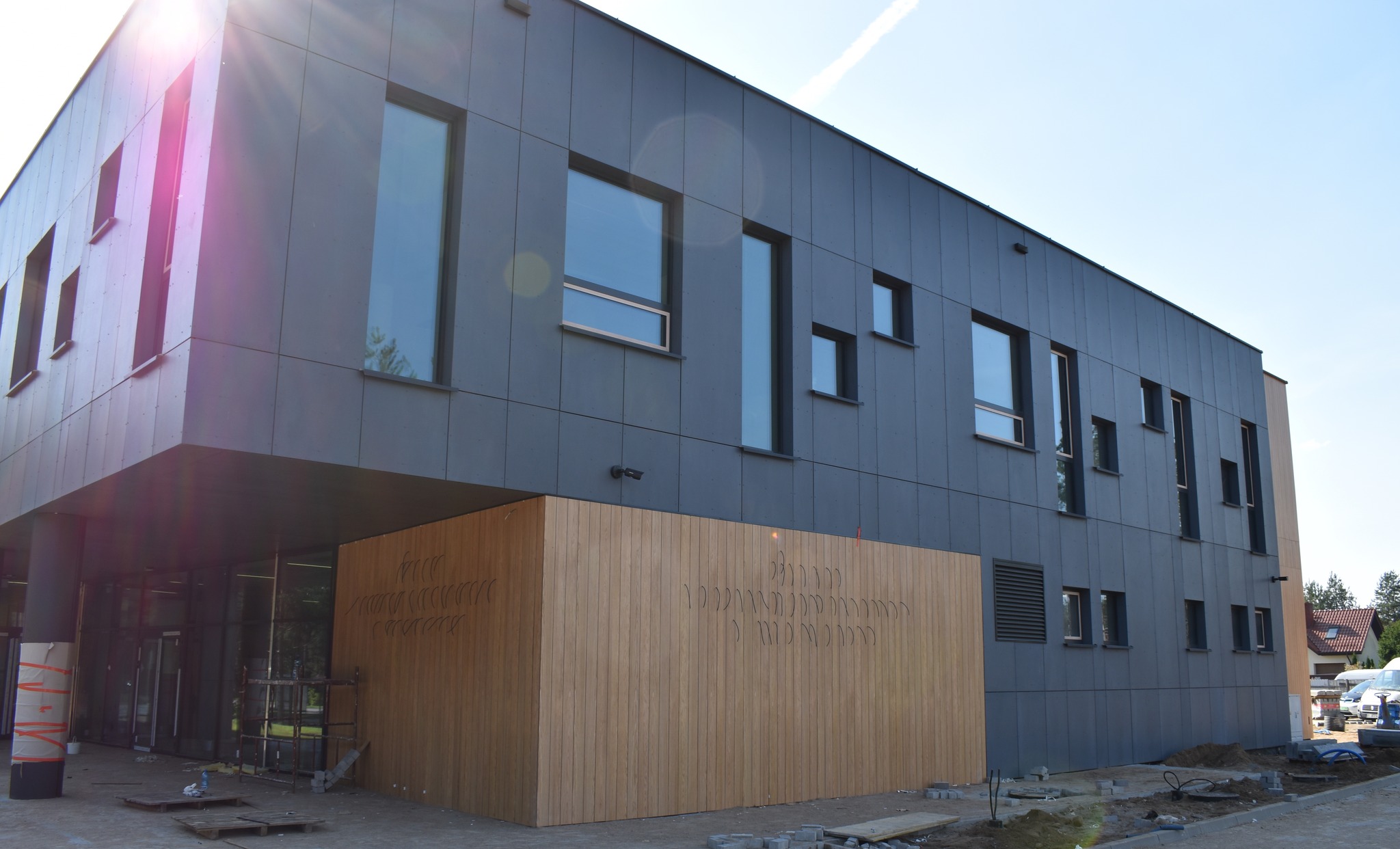 Elewacje reprezentacyjne od strony wjazdu na teren inwestycji z wejściem głównym zaprojektowano w układzie ścian trójwarstwowych . Na elewacji występują liczne przeszklenia w formie fasad i okien. W podcieniu przy wejściu głównym zaprojektowano ścianę w formie fasady szklanej. Na wysokości pietra na elewacji wschodniej i północnej zaprojektowano liczne przeszklenia w postaci okien o zróżnicowanym kształcie. Na elewacji południowej zaprojektowano fasadę szklaną na wysokości dwóch kondygnacji przechodząca na elewacje wschodnią.