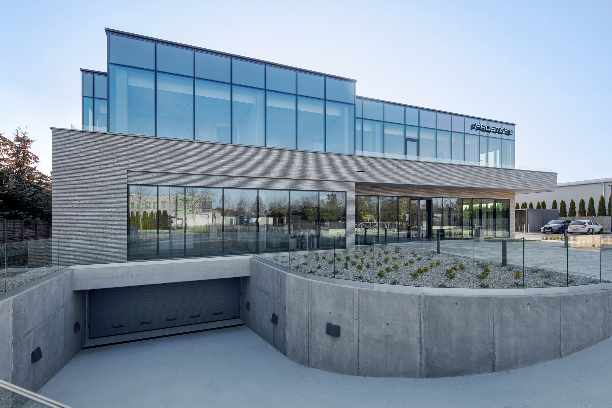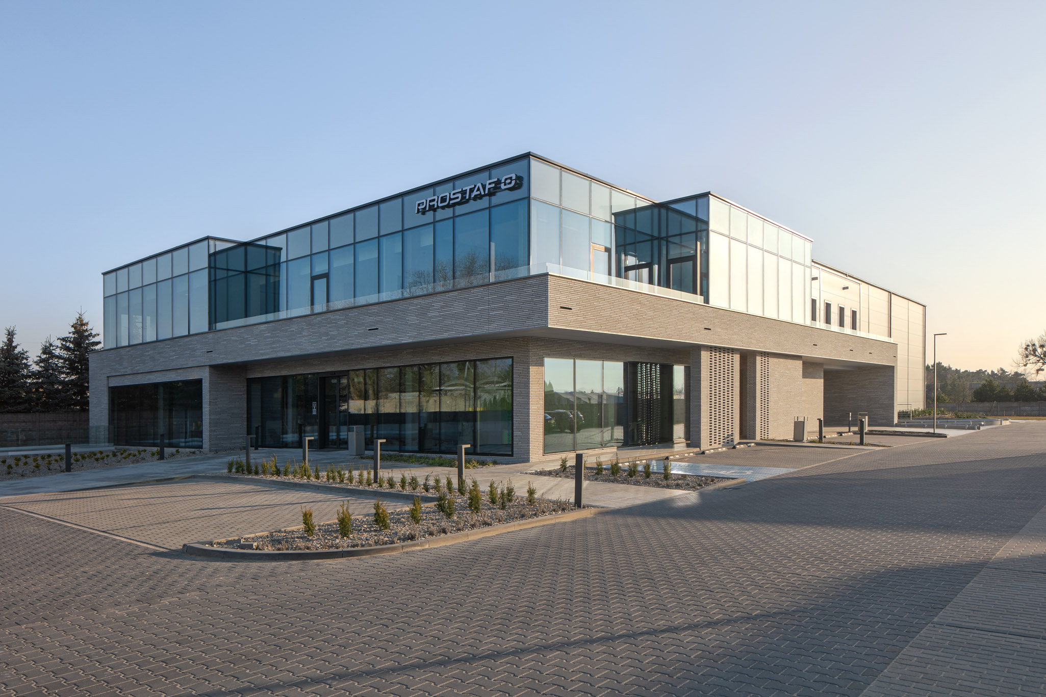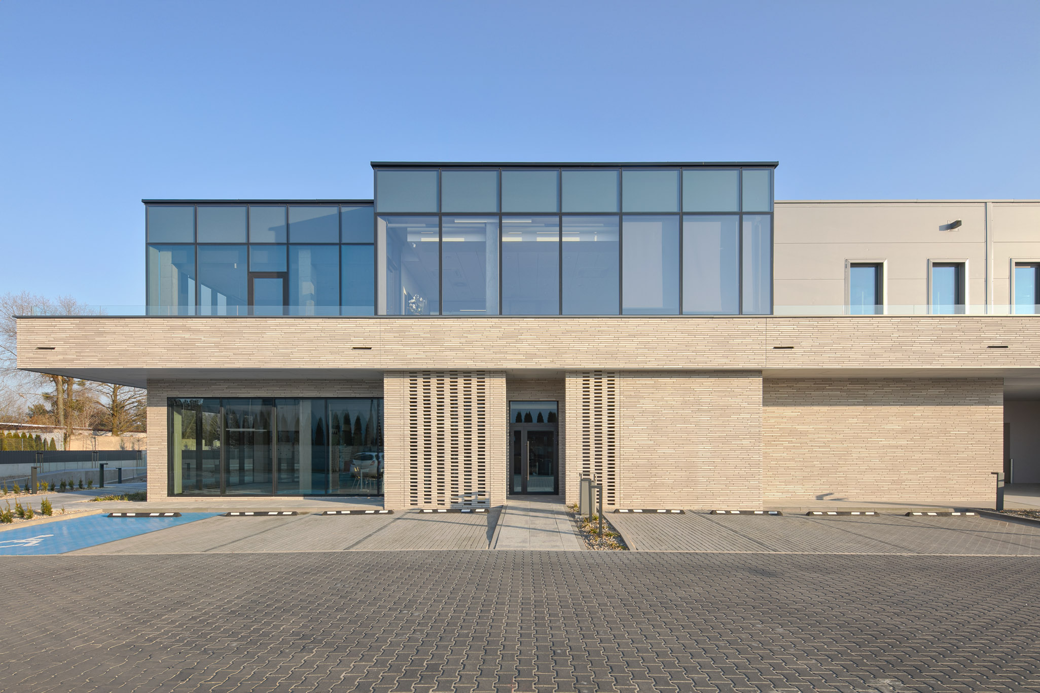 Budynek biurowo-magazynowy w Suchym Lesie został zaprojektowany jako prosta, ponadczasowa forma architektoniczna, w której kluczową rolę odgrywa funkcjonalność i szlachetność zastosowanych materiałów. Bryła składa się z dwóch przenikających się prostopadłościanów, wyraźnie odzwierciedlających podział na część biurową oraz strefy magazynowe. Reprezentacyjna elewacja frontowa łączy ciężar ceglanego parteru z lekką, przeszkloną kondygnacją piętra, nadając budynkowi elegancji i wizualnej równowagi.