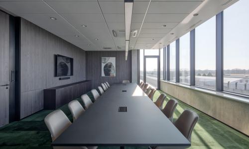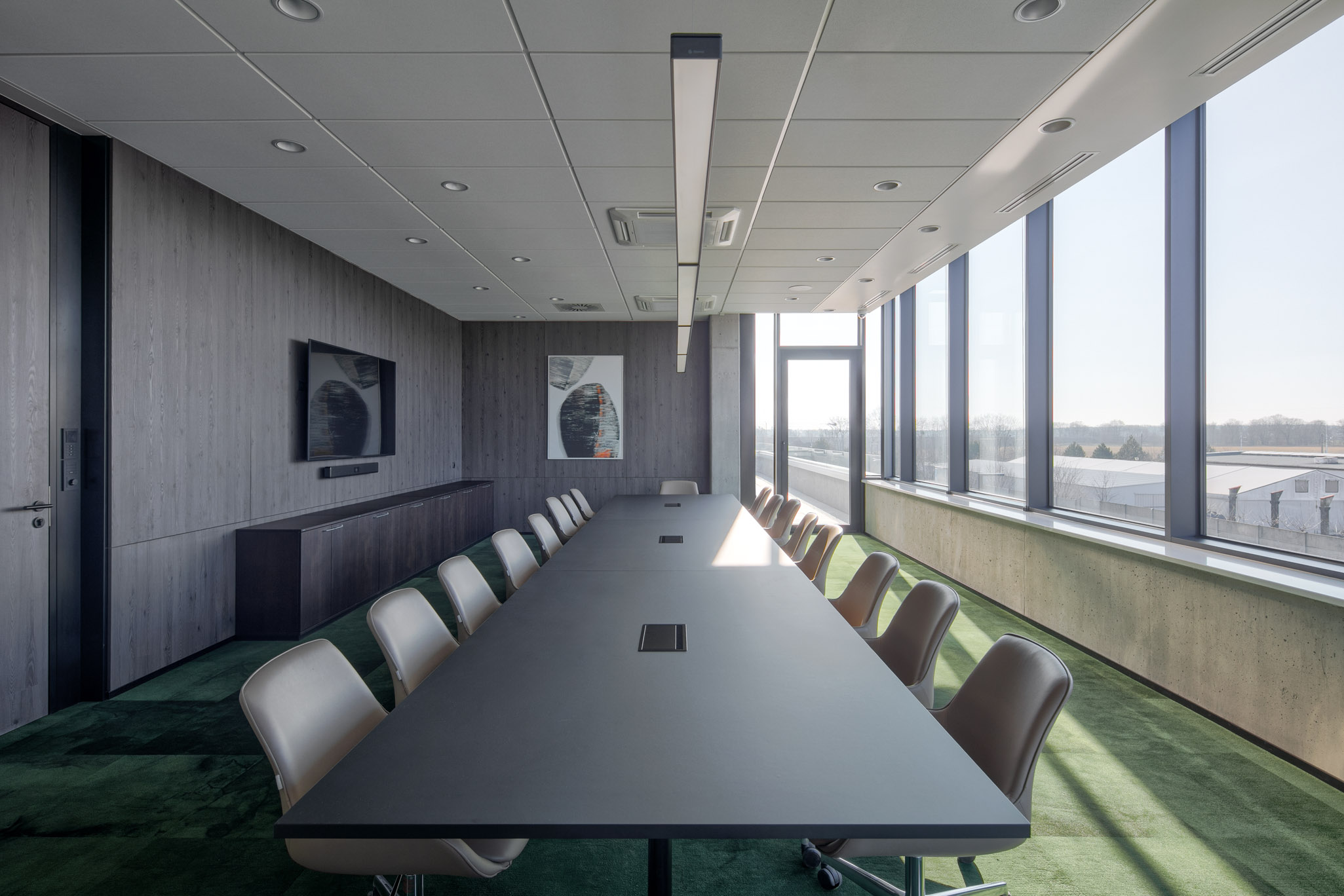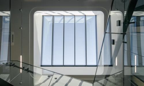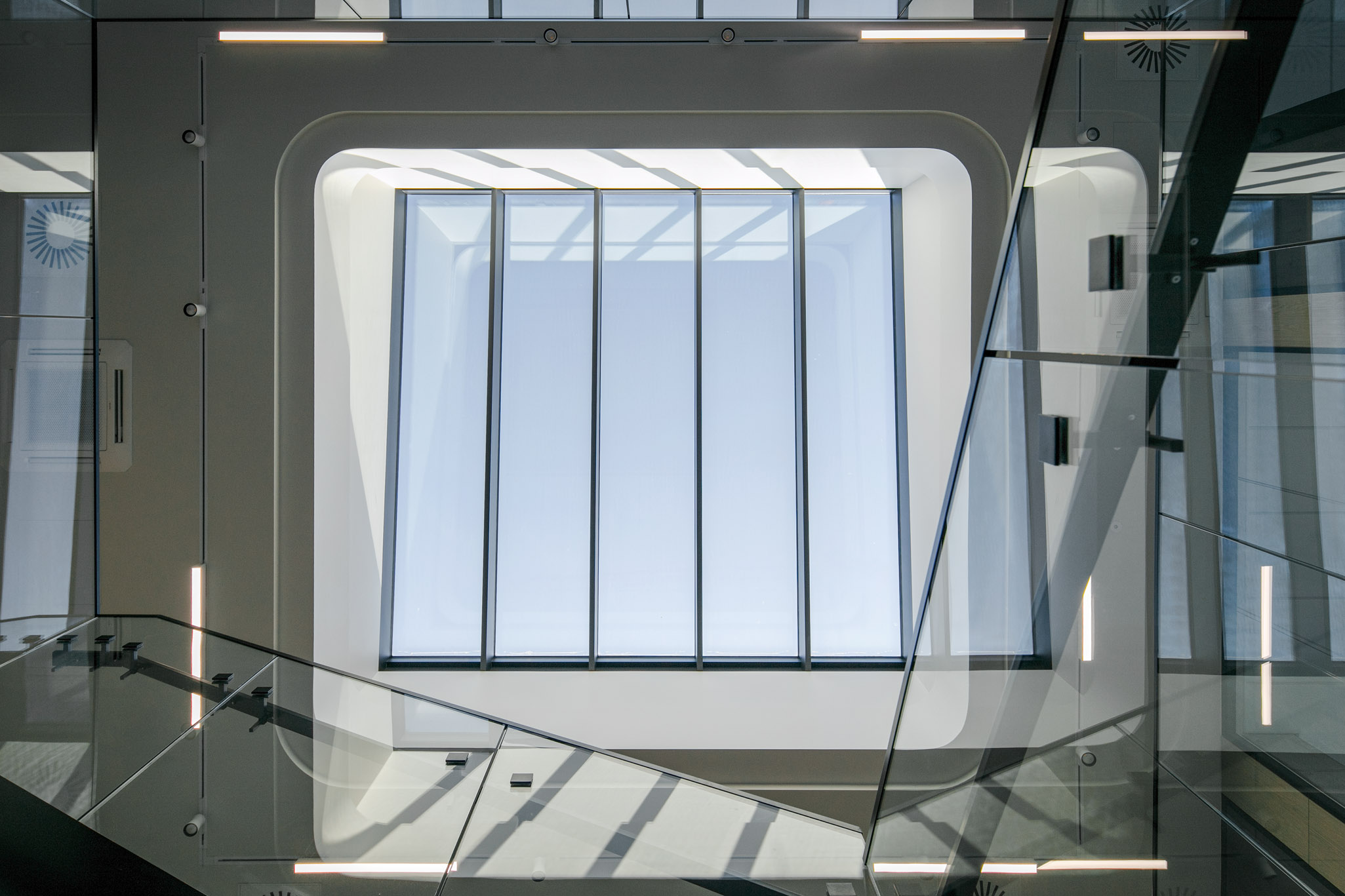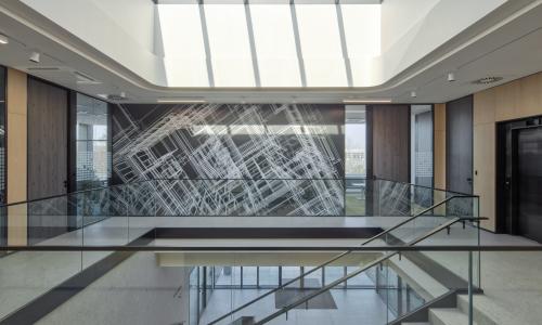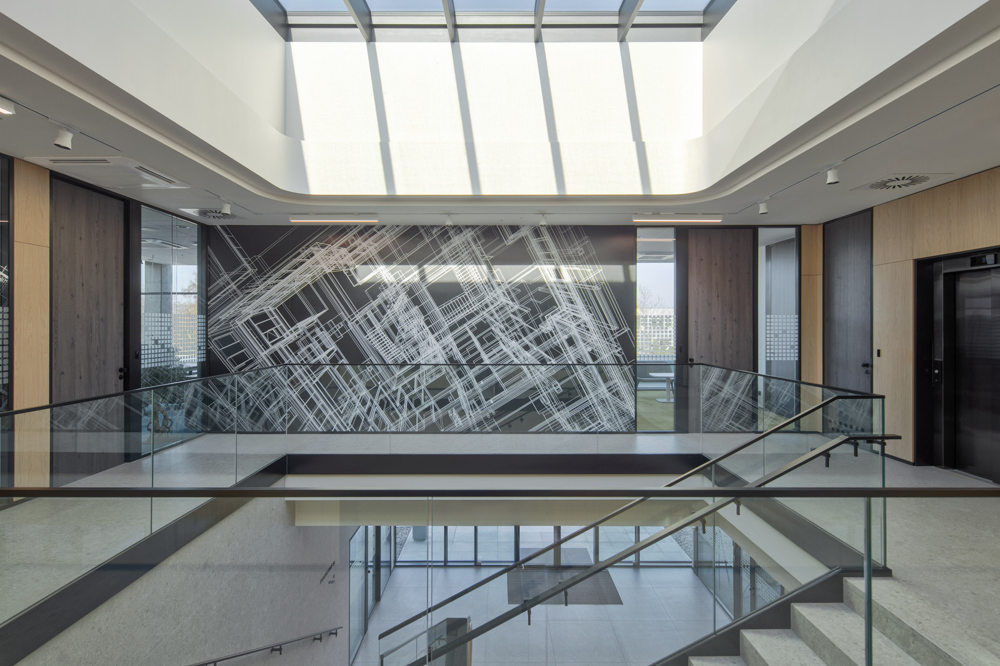 Wnętrze zostało zaprojektowane w oparciu o analizę rytmu pracy użytkowników, co przełożyło się na czytelny układ funkcjonalny i płynne powiązania między strefami. Centralnym elementem jest reprezentacyjna klatka schodowa ze świetlikiem, integrująca przestrzeń i użytkowników. Całość uzupełniają trwałe, naturalne materiały oraz rozwiązania energooszczędne, takie jak pompa ciepła i instalacja fotowoltaiczna, podkreślające nowoczesny i świadomy charakter inwestycji.