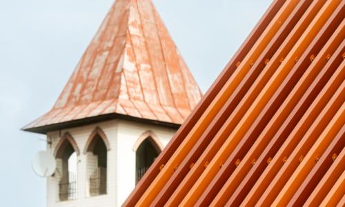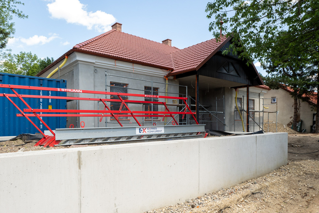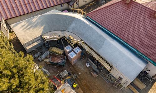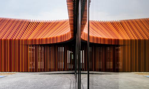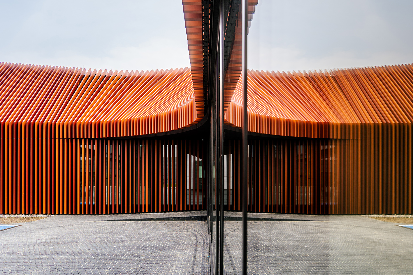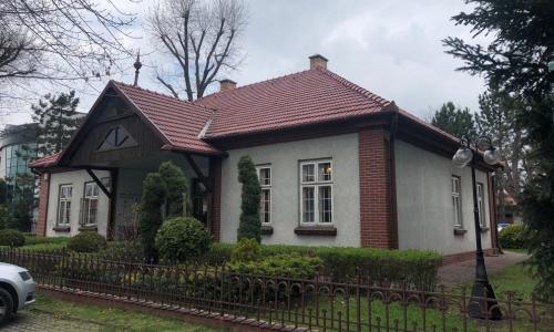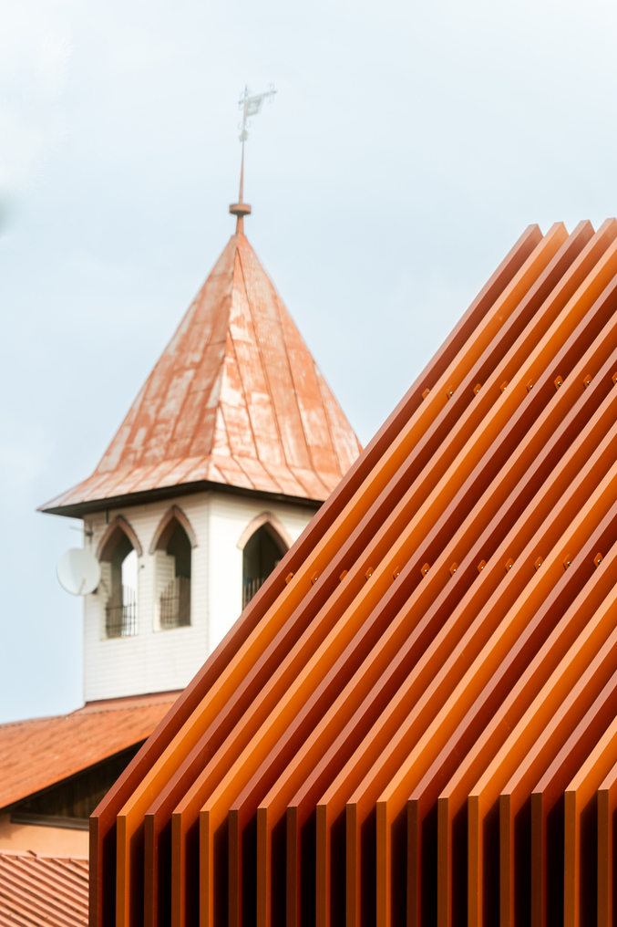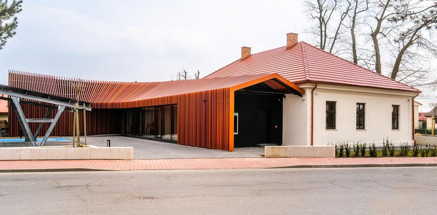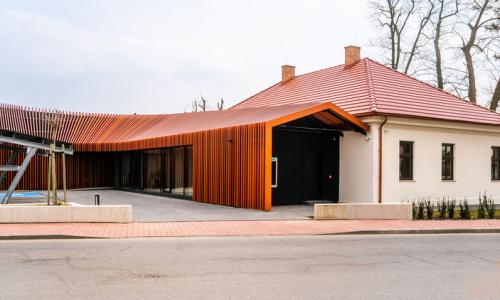 Najważniejszym założeniem było wpisanie nowej formy w kontekst historyczny poprzez kolor. Elewacja nowej części bezpośrednio nawiązuje do charakterystycznej dla sąsiedztwa ceramiki dachowej. Naturalnie wypalany kolor dachówek został „sprowadzony” z dachu na ściany, tworząc monolityczną bryłę, która harmonizuje z bielą i kremem tynków zabytkowych obiektów zlokalizowanych przy Puszczy Niepołomickiej. Całość dopełnia głęboki antracyt nowoczesnej ślusarki okiennej.