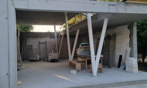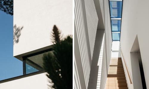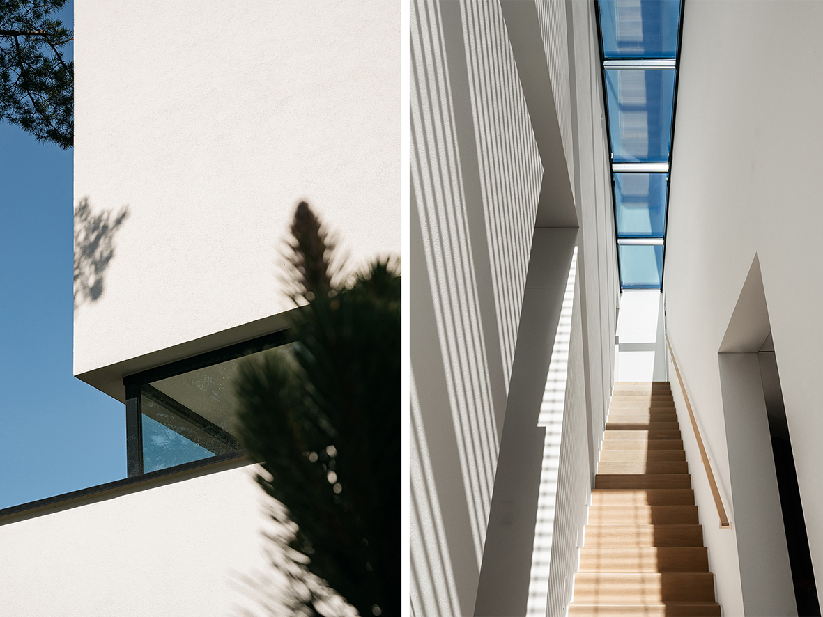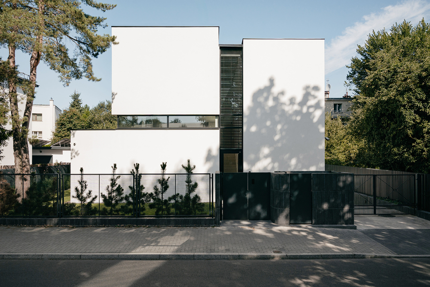 Budynek operuje czystą geometrią, rezygnując z symetrii na rzecz dynamicznego układu brył. Głównym elementem kompozycyjnym jest nadwieszona kondygnacja piętra, która dzięki wsparciu na filigranowych, stalowych słupach sprawia wrażenie lewitującej nad przeszklonym parterem. Efekt dematerializacji przyziemia pozwala na płynne przenikanie się ogrodu z wnętrzem domu. Monolityczny charakter białych elewacji podkreślono poprzez zlicowanie płaszczyzn okien z tynkiem, co eliminuje zbędne podziały i wzmacnia minimalistyczny wyraz obiektu.