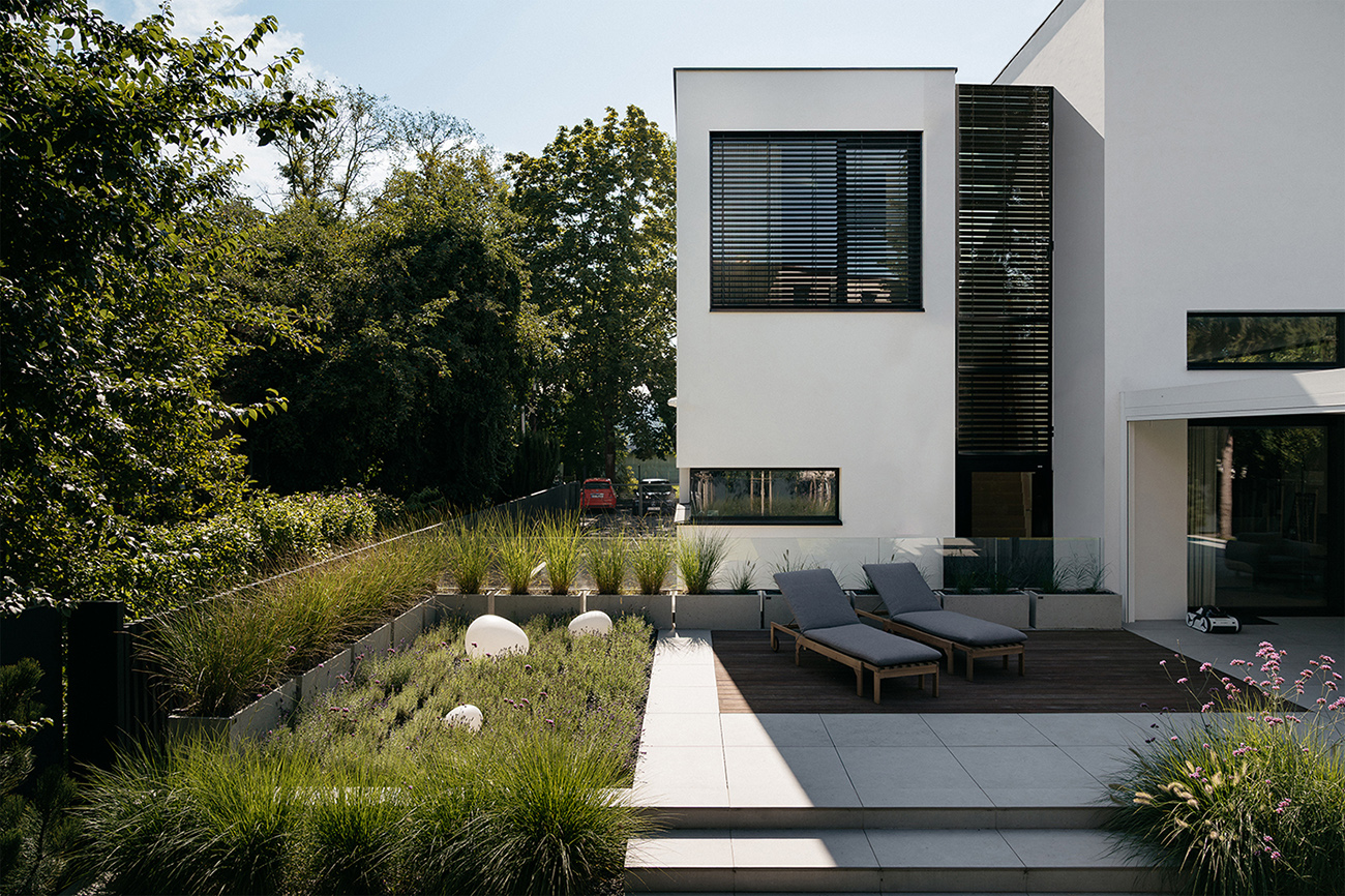 Projekt implementuje zaawansowane rozwiązania energooszczędne, w tym wentylację mechaniczną z odzyskiem ciepła oraz systemy inteligentnego zarządzania budynkiem. Świadome podejście do ekologii przejawia się w zastosowaniu stropodachu zielonego nad wjazdem do garażu, który zwiększa powierzchnię biologicznie czynną i retencję wody opadowej. Wykorzystanie szlachetnych materiałów – tynków silikonowych o wysokiej refleksyjności, antracytowej ślusarki aluminiowej oraz naturalnych kompozytów – gwarantuje trwałość i wysoką jakość starzenia się architektury.