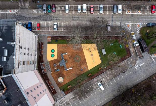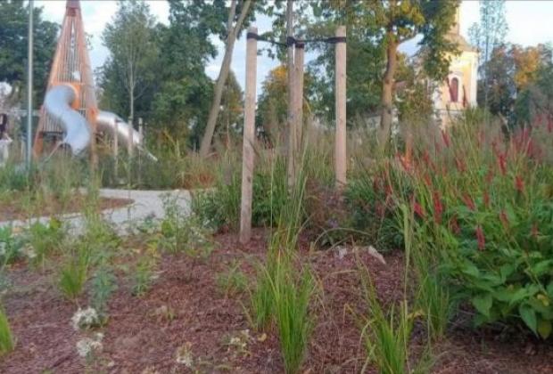 Skwer miejski z nowoczesnym placem zabaw i siłownią zewnętrzną ul. Pszenna/Jęczmienna we Wrocławiu