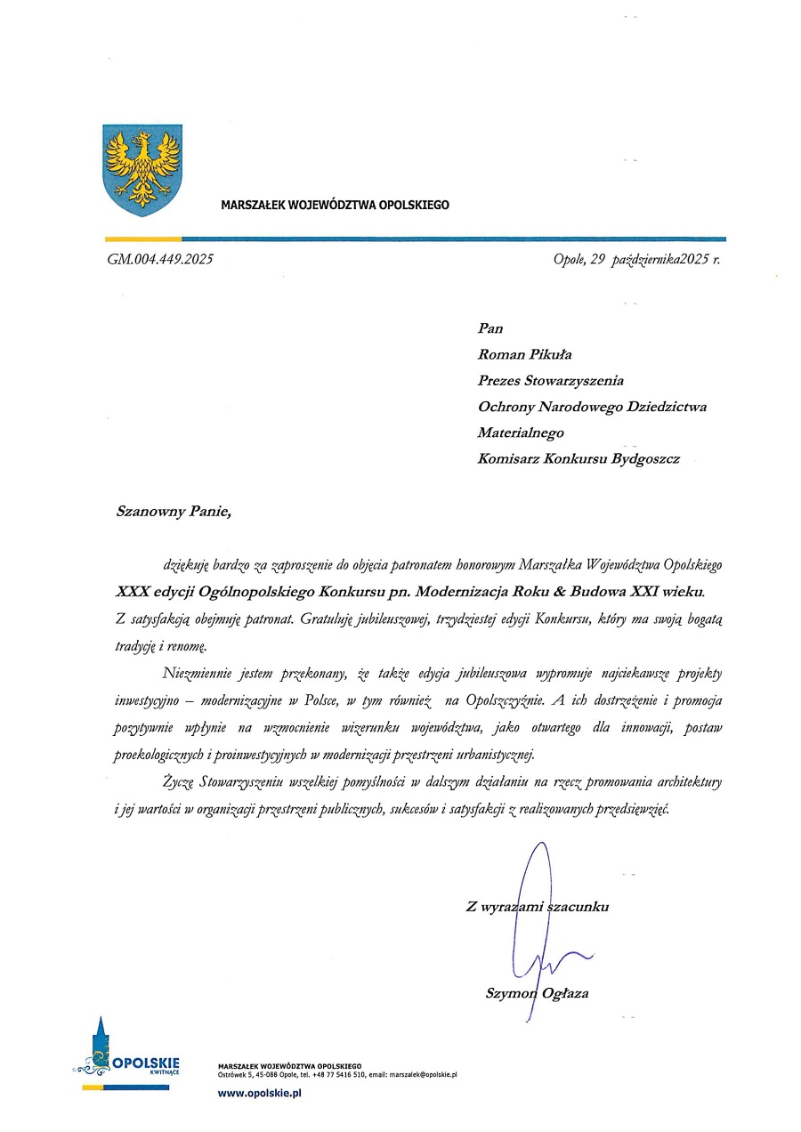 Z satysfakcją informujemy, że Marszałek Województwa Opolskiego – Pan Szymon Ogłaza objął patronatem honorowym jubileuszową 30. edycję Ogólnopolskiego Konkursu „Modernizacja Roku & Budowa XXI wieku”.